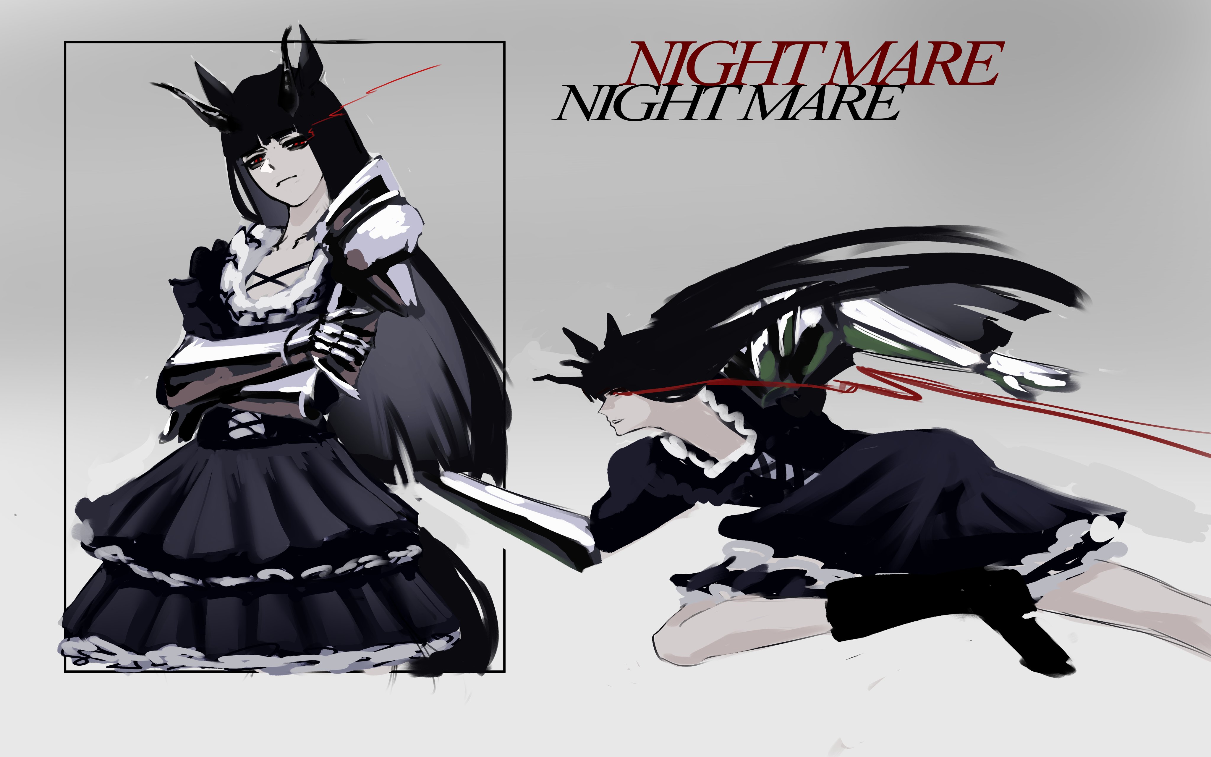1girl :t absurdres animal_ears black_hair black_socks borrowed_clothes character_request check_character colored_inner_hair corset crossed_arms dashing feet_out_of_frame gauntlets genderswap genderswap_(mtf) highres horns horse_ears jiejiepen kemonomimi_mode lace_trim long_hair looking_at_viewer motion_blur multicolored_hair red_eyes shadow_slave socks solo sunny_(shadow_slave) umamusume