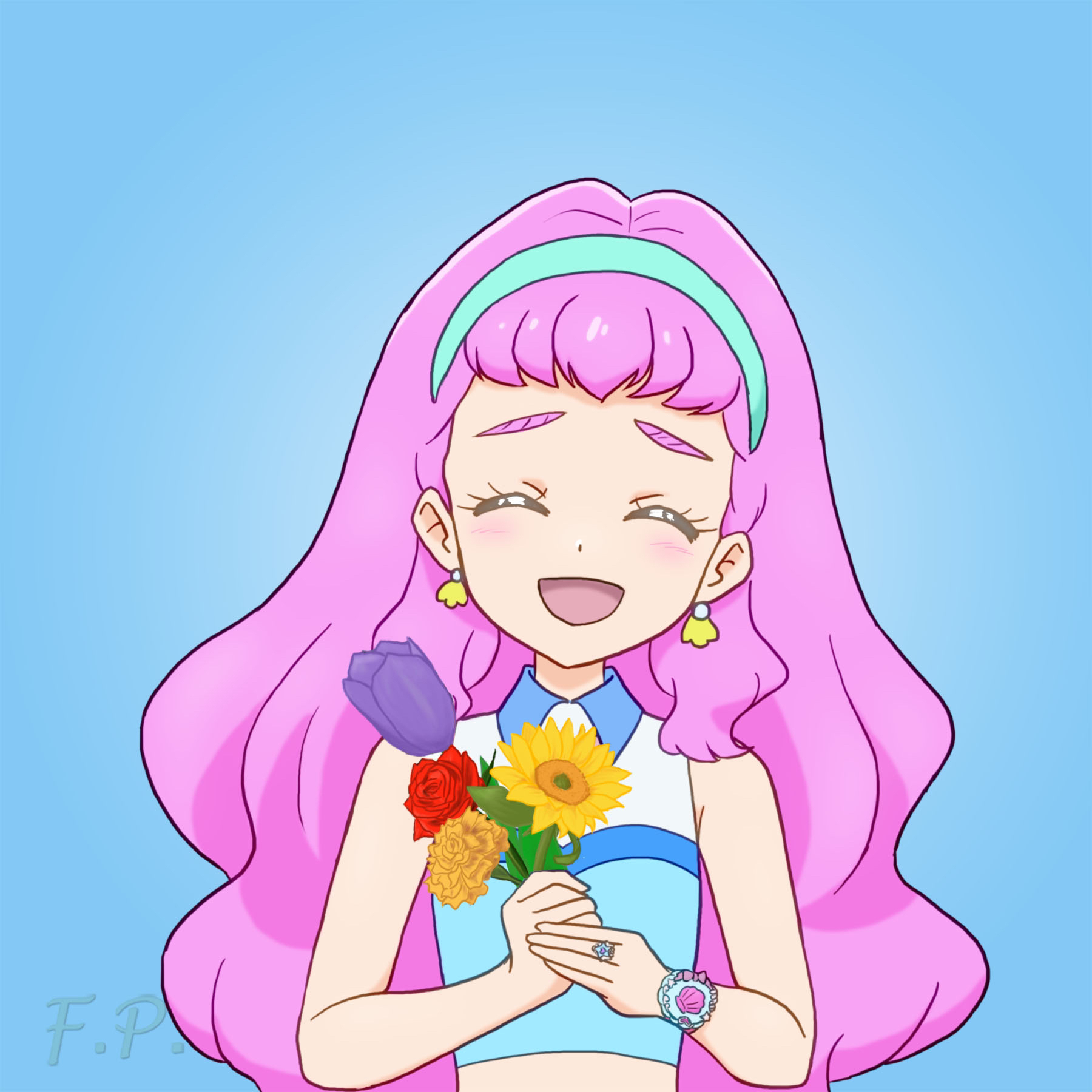 1girl ^_^ aqua_hairband bare_arms bare_shoulders blue_background blue_shirt blush carnation closed_eyes collared_shirt commentary crop_top cropped_shirt dot_nose earrings facing_viewer flower fuefukipiper furrowed_brow hairband hands_up highres holding holding_flower jewelry laura_la_mer long_hair midriff open_mouth orange_flower pink_hair precure purple_flower purple_tulip red_flower red_rose ring rose shell shell_earrings shirt simple_background sleeveless sleeveless_shirt smile solo straight-on sunflower thick_eyebrows tropical-rouge!_precure tulip upper_body watch wristwatch yellow_flower