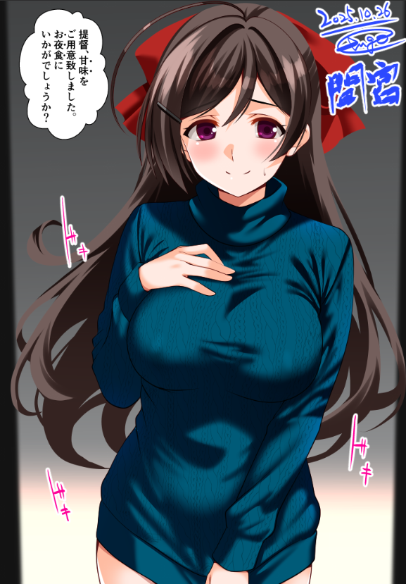 1girl ahoge blue_sweater brown_hair character_name clothes_pull commentary_request cowboy_shot dated engo_(aquawatery) gradient_background hair_ribbon half_updo hand_on_own_chest kantai_collection long_hair mamiya_(kancolle) one-hour_drawing_challenge red_eyes red_ribbon ribbon signature smile solo sweater sweater_pull translation_request