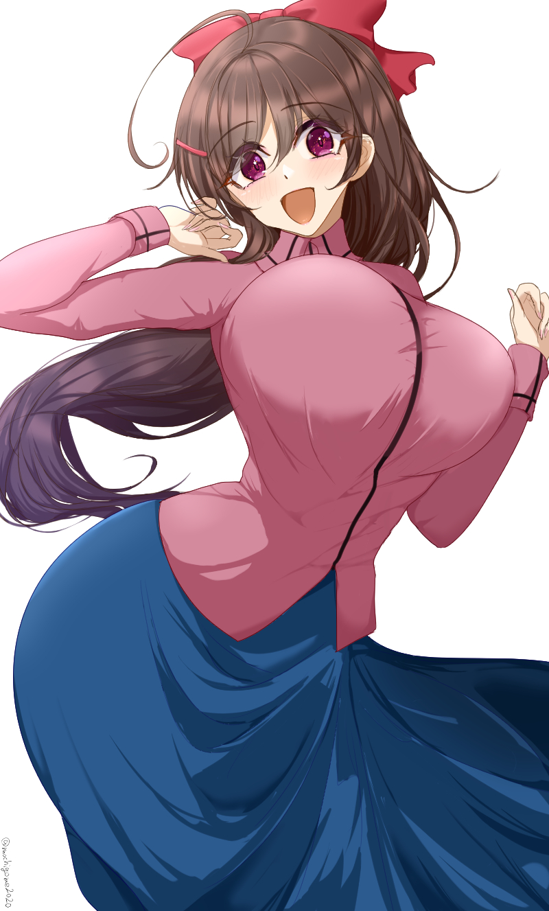 1girl ahoge blue_skirt bouncing_breasts breasts brown_hair chamumi_(mochiumee) dress_shirt feet_out_of_frame hair_ribbon half_updo highres kantai_collection large_breasts long_hair mamiya_(kancolle) one-hour_drawing_challenge open_mouth pink_shirt red_eyes red_ribbon ribbon shirt skirt smile solo
