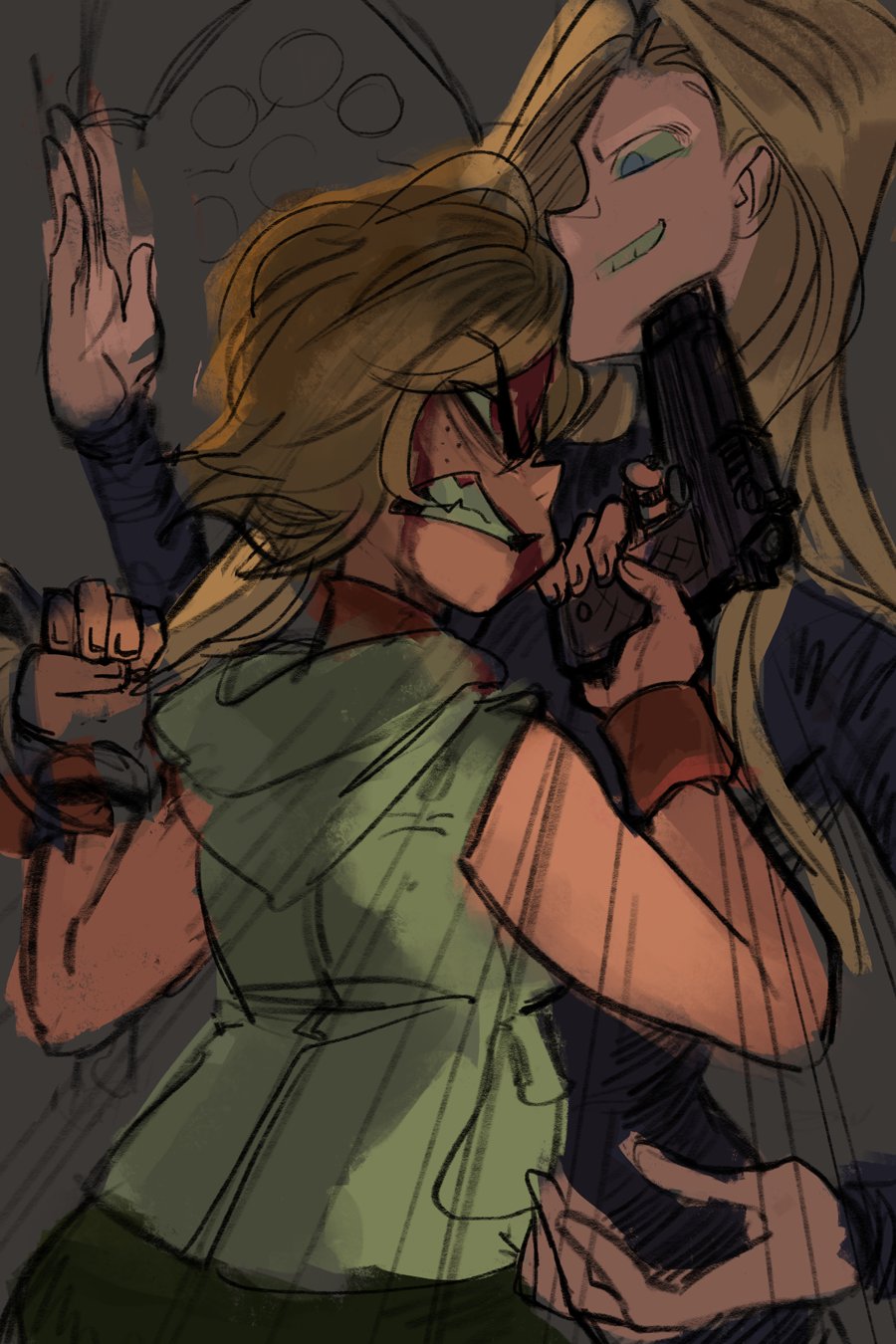 2girls alex_ahad blonde_hair blood blue_eyes claudia_wolf clenched_teeth dress freckles grin gun handgun heather_mason highres holding holding_weapon jacket looking_at_another motion_lines multiple_girls pistol red_eyes silent_hill_(series) silent_hill_3 sketch smile speed_lines teeth upper_body weapon wristband