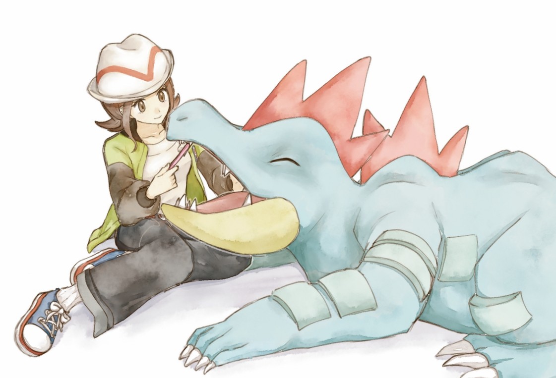 1girl asuka_rkgk blue_shoes brown_eyes brown_hair brushing_teeth closed_mouth collarbone commentary feraligatr gen_2_pokemon green_jacket harmony_(pokemon) hat holding holding_toothbrush jacket long_sleeves nintendo open_clothes open_jacket pants pokemon pokemon_(creature) pokemon_legends:_z-a ribbed_socks shirt shoes sidelocks simple_background sitting smile socks symbol-only_commentary toothbrush white_background white_hat white_shirt white_socks