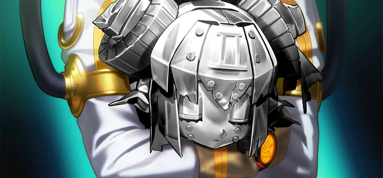 1boy 1girl android broken broken_horns closed_eyes disembodied_head elizabeth_bathory_(fate) fate/grand_order fate_(series) fujimaru_ritsuka_(male) fujimaru_ritsuka_(male)_(captain_chaldea) game_cg green_background holding_detached_head horns lasengle mecha_eli-chan_mk.ii_(fate) official_art robot spacesuit third-party_source wada_arco
