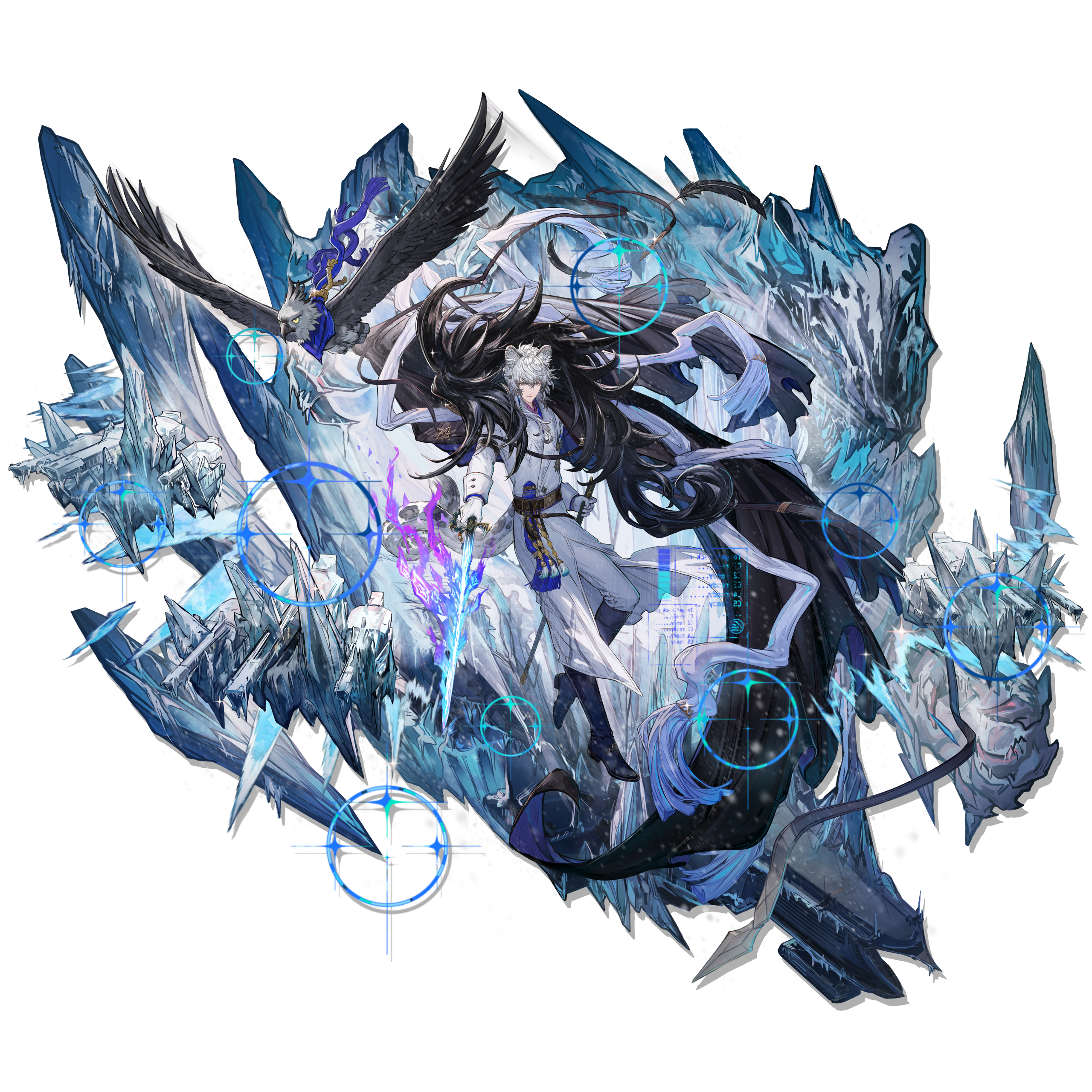 1boy absurdres animal animal_ears arknights bird bishounen black_cape blue_theme cape closed_mouth floating floating_cape formal_clothes full_body fur-trimmed_cape fur_trim gloves grey_eyes highres holding holding_sheath holding_sword holding_weapon light_smile male_focus official_alternate_costume official_art ryuuzaki_ichi scabbard sheath silverash_(arknights) silverash_the_reignfrost_(arknights) simple_background snow_leopard_boy snow_leopard_ears snow_leopard_tail solo sword tail tenzin_(arknights) third-party_source transparent_background unsheathed weapon white_gloves white_hair