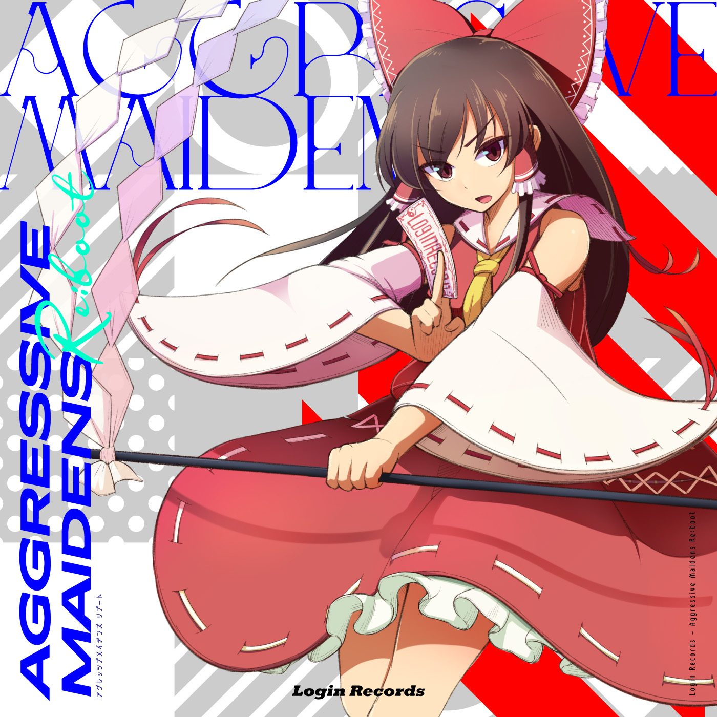 1girl album_cover album_name ascot between_fingers bow brown_eyes brown_hair circle_name commentary_request cover detached_sleeves english_text frilled_bow frilled_hair_tubes frilled_skirt frills gohei hair_bow hair_tubes hakurei_reimu highres holding holding_gohei ishitsubute login_records long_hair looking_at_viewer ofuda ofuda_between_fingers open_mouth red_bow red_skirt ribbon-trimmed_skirt ribbon-trimmed_sleeves ribbon_trim second-party_source skirt skirt_set solo touhou yellow_ascot