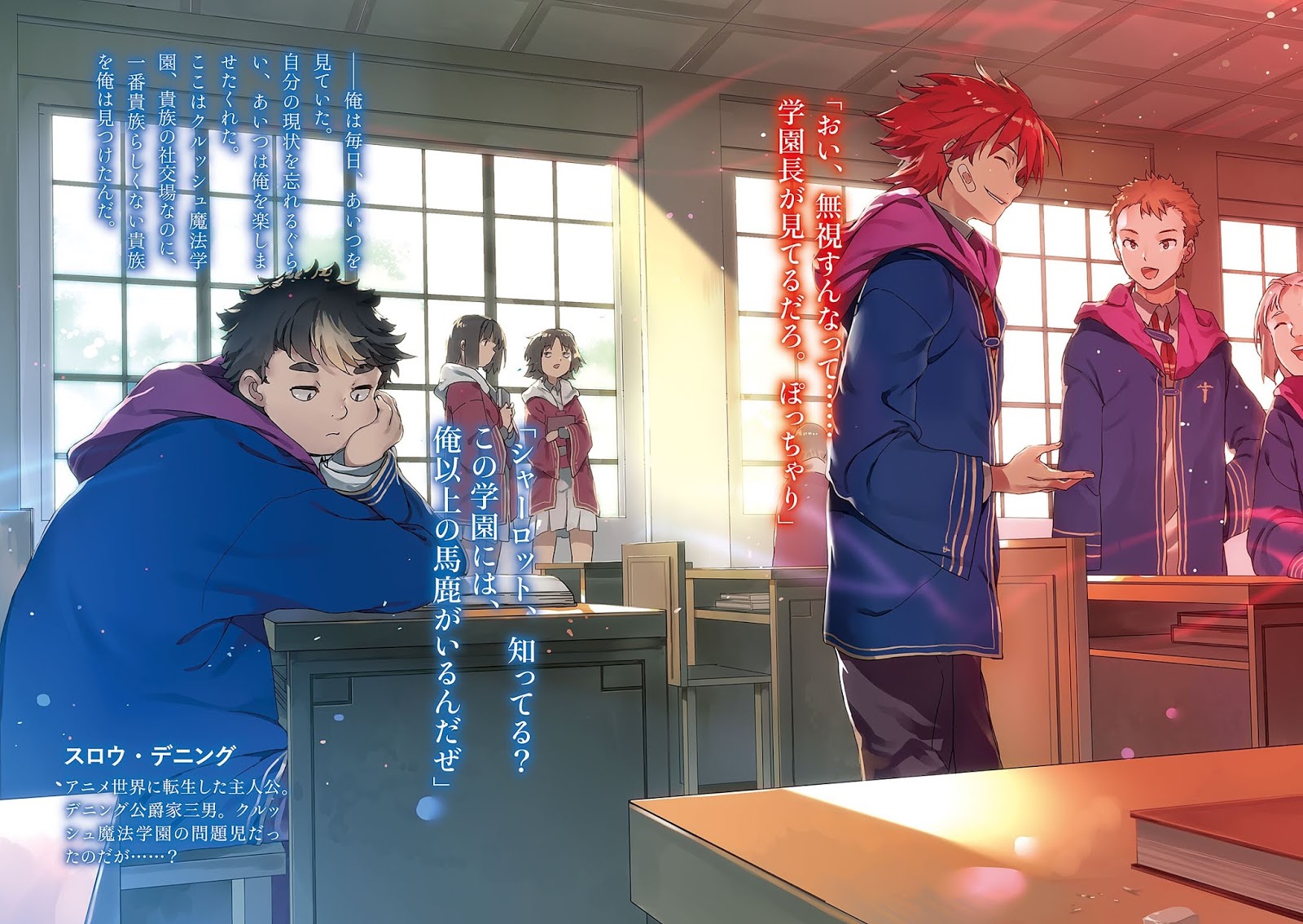 2boys ^_^ arm_rest bandaid bandaid_on_cheek bandaid_on_face black_hair blue_robe book buta_koushaku ceiling chair classroom closed_eyes closed_mouth desk elbow_rest fat fat_man from_side grey_pants hand_on_own_cheek hand_on_own_face head_rest highres hooded_robe indoors long_sleeves looking_down multicolored_hair multiple_boys nauribon novel_illustration official_art on_chair open_hand pants people profile purple_hood red_hair robe school school_chair school_desk school_uniform short_hair shuya_nyukern sitting slow_denning standing third-party_source translation_request two-tone_hair white_hair wide_shot wide_sleeves window