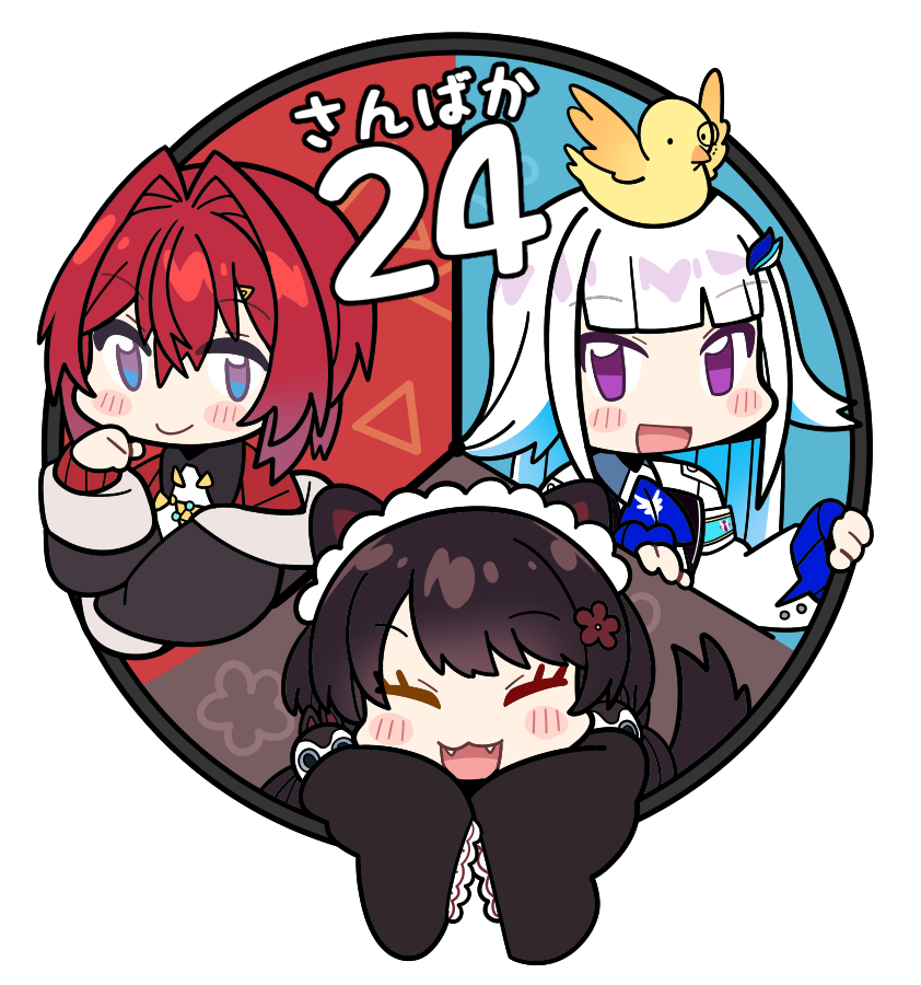 3girls :d ^_^ analog_clock ange_katrina ange_katrina_(1st_costume) animal animal_ears animal_hair_ornament animal_on_head bird bird_on_head blue_eyes blue_hair blunt_bangs blush_stickers brown_hair brown_tail chibi chibi_only clock closed_eyes closed_mouth colored_inner_hair commentary_request dog_ears dog_girl dog_tail fangs flower group_name hair_between_eyes hair_flower hair_intakes hair_ornament hand_up heterochromia inui_toko inui_toko_(1st_costume) lize_helesta lize_helesta_(1st_costume) long_hair looking_at_viewer maid_headdress mitsumine_(ookami_no_oyashiro) monocle multicolored_eyes multicolored_hair multiple_girls nijisanji no_pupils on_head open_mouth purple_eyes red_hair sanbaka_(nijisanji) sebastian_piyodore short_hair simple_background sleeves_past_fingers sleeves_past_wrists smile tail through_medium translated two-tone_eyes two-tone_hair virtual_youtuber white_background white_hair white_headdress yellow_bird