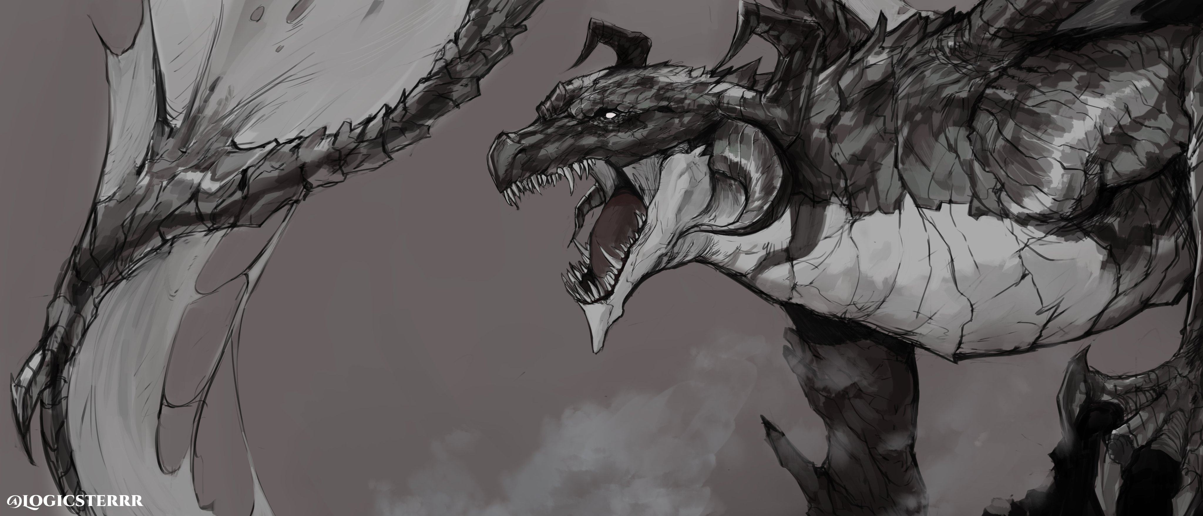 1other absurdres animal_focus commentary creature english_commentary greyscale highres horns logicsterrr monochrome open_mouth out_of_frame roaring scales shadow_slave sharp_teeth teeth