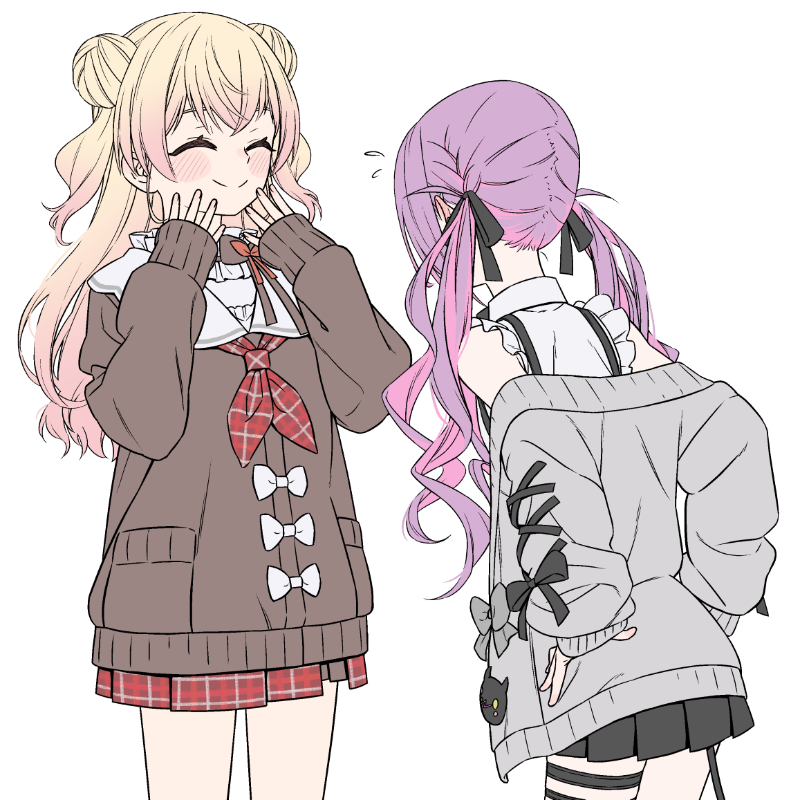 2girls bibi_(tokoyami_towa) black_bow black_skirt black_tail blonde_hair blush bow brown_cardigan cardigan closed_eyes closed_mouth collar collared_shirt commentary_request crossed_bangs double_bun facing_another flying_sweatdrops frilled_collar frilled_shirt frills gradient_hair grey_cardigan hair_bow hair_bun half-skirt hands_on_own_hips hands_up hololive jirai_kei leaning_forward long_hair momosuzu_nene momosuzu_nene_(casual) multicolored_hair multiple_girls off_shoulder official_alternate_costume pink_hair plaid_clothes plaid_skirt pleated_skirt purple_hair rainna red_skirt sailor_collar shirt simple_background skirt smile standing thigh_strap tokoyami_towa tokoyami_towa_(jirai_kei) twintails two_side_up virtual_youtuber white_background white_sailor_collar