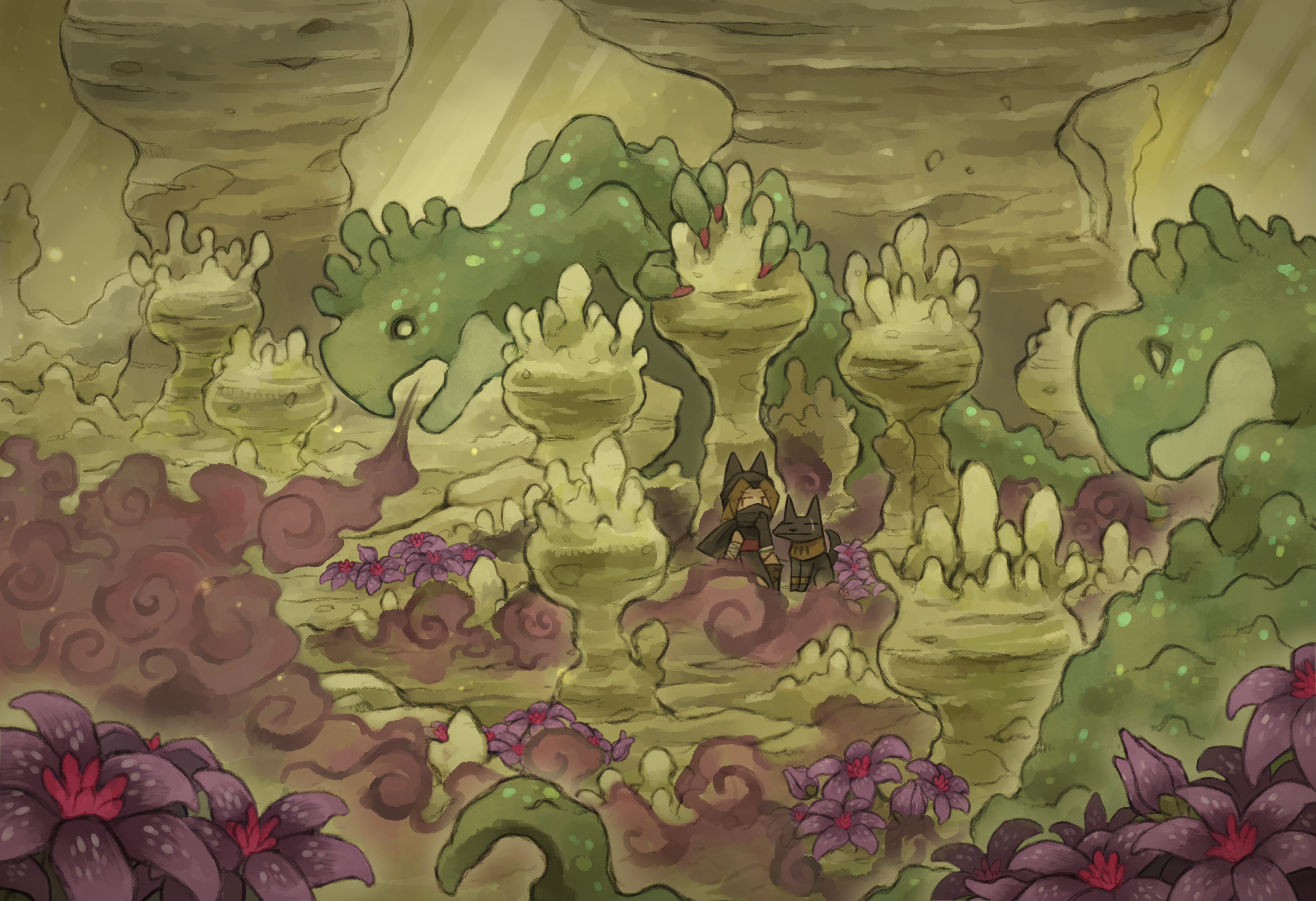 absurdres animal_ear_headwear animal_ears arm_wrap black_gloves black_hat black_mask black_shirt brown_hair commentary dog fake_animal_ears fantasy flower gloves hand_up hat highres koki08186863 mask medium_hair monster mouth_mask ninja original purple_flower shirt sleeveless sleeveless_shirt wide_shot