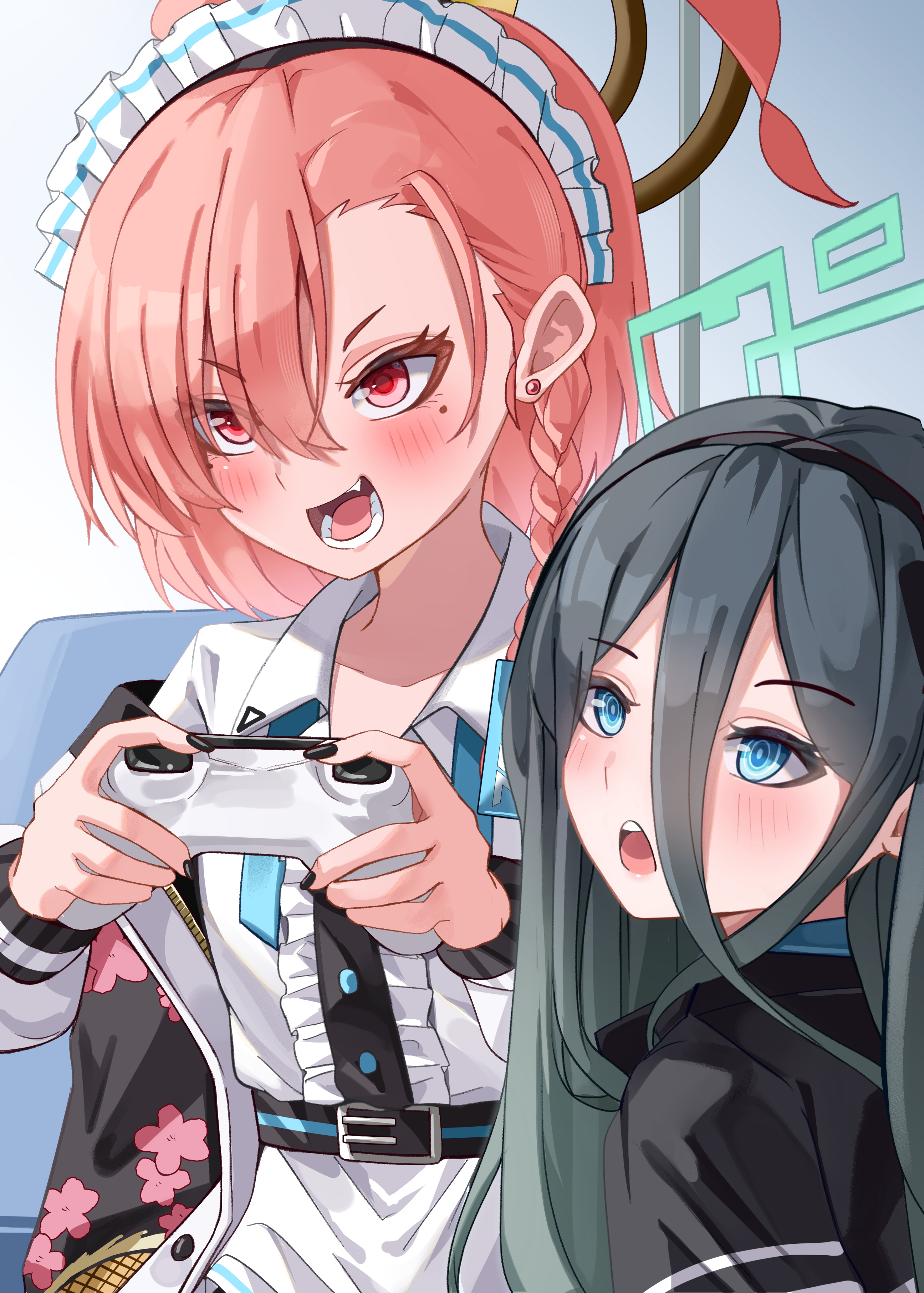 2girls :d absurdres ahoge aris_(blue_archive) black_hair black_nails blue_archive blue_eyes blush braid brown_halo center_frills collared_shirt commentary_request controller double-parted_bangs earrings eyelashes eyes_visible_through_hair fang frilled_shirt frills game_controller green_halo hair_between_eyes halo hands_up highres holding holding_controller holding_game_controller huge_ahoge id_card indoors jewelry long_hair long_hair_between_eyes looking_ahead mahoro_(minase_mahoro) maid maid_headdress mole mole_under_each_eye mole_under_eye multiple_girls multiple_moles nail_polish neru_(blue_archive) open_mouth orange_hair playing_games rectangular_halo red_eyes ringed_eyes shirt short_hair single_braid smile smirk straight_hair stud_earrings teeth tongue tsurime upper_body upper_teeth_only v-shaped_eyebrows white_shirt