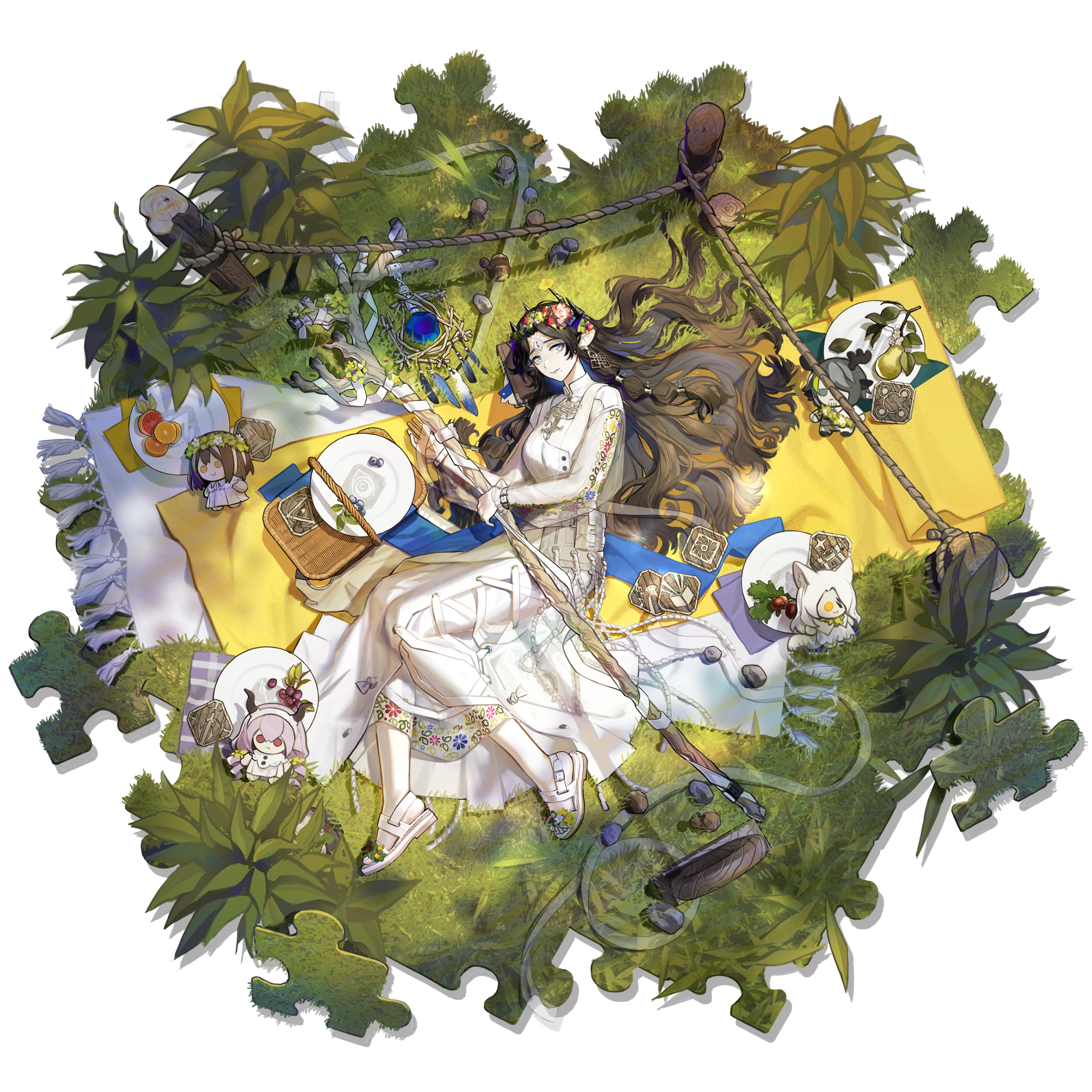 1girl arknights black_hair blue_eyes brown_hair cameo character_doll doll eikthyrnir_(arknights) facial_mark five-fall forehead_mark full_body grass green_theme hair_spread_out highres holding holding_staff horns long_hair lying magallan_(arknights) mole mole_under_mouth multi-tied_hair multiple_horns official_art on_grass on_side picnic picnic_basket picnic_blanket pointy_ears santalla_(arknights) simple_background solo staff third-party_source third_eye transparent_background typhon_(arknights) valarqvin_(arknights) valarqvin_(midskog_fika)_(arknights) wavy_hair