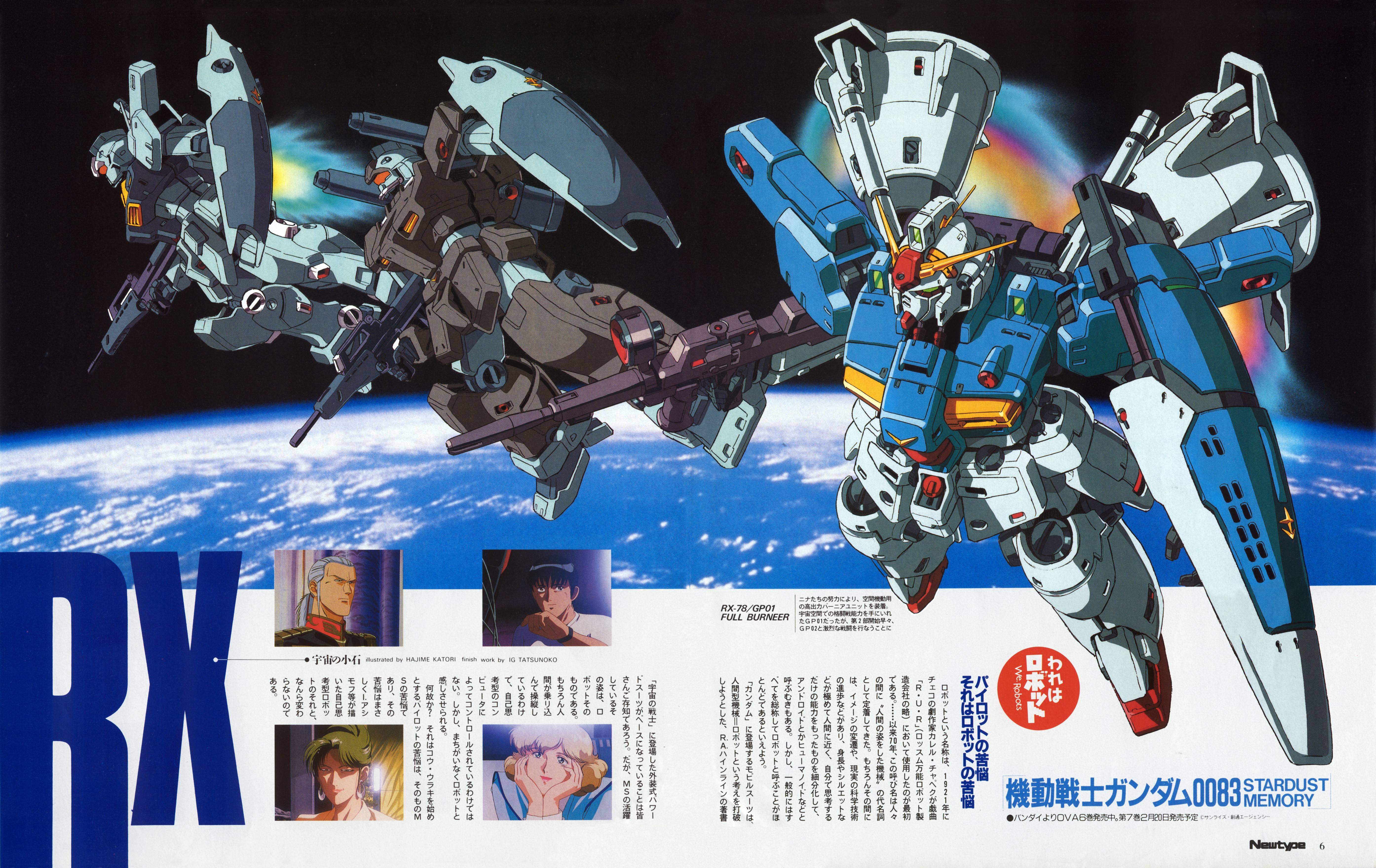1990s_(style) 2boys 2girls absurdres anavel_gato anime_screenshot_inset artist_request assault_rifle beam_rifle black_hair blonde_hair cannon cima_garahau cloud energy_gun gm_custom green_eyes gun guncannon_mp_type gundam gundam_0083 gundam_gp-01_full_vernian_zephyranthes gundam_gp-01_zephyranthes highres in_orbit kou_uraki machinery magazine_scan mecha military_uniform mobile_suit multiple_boys multiple_girls newtype nina_purpleton ocean official_art orange_visor promotional_art retro_artstyle rifle robot scan science_fiction shield shoulder_cannon thrusters translation_request v-fin weapon zeon