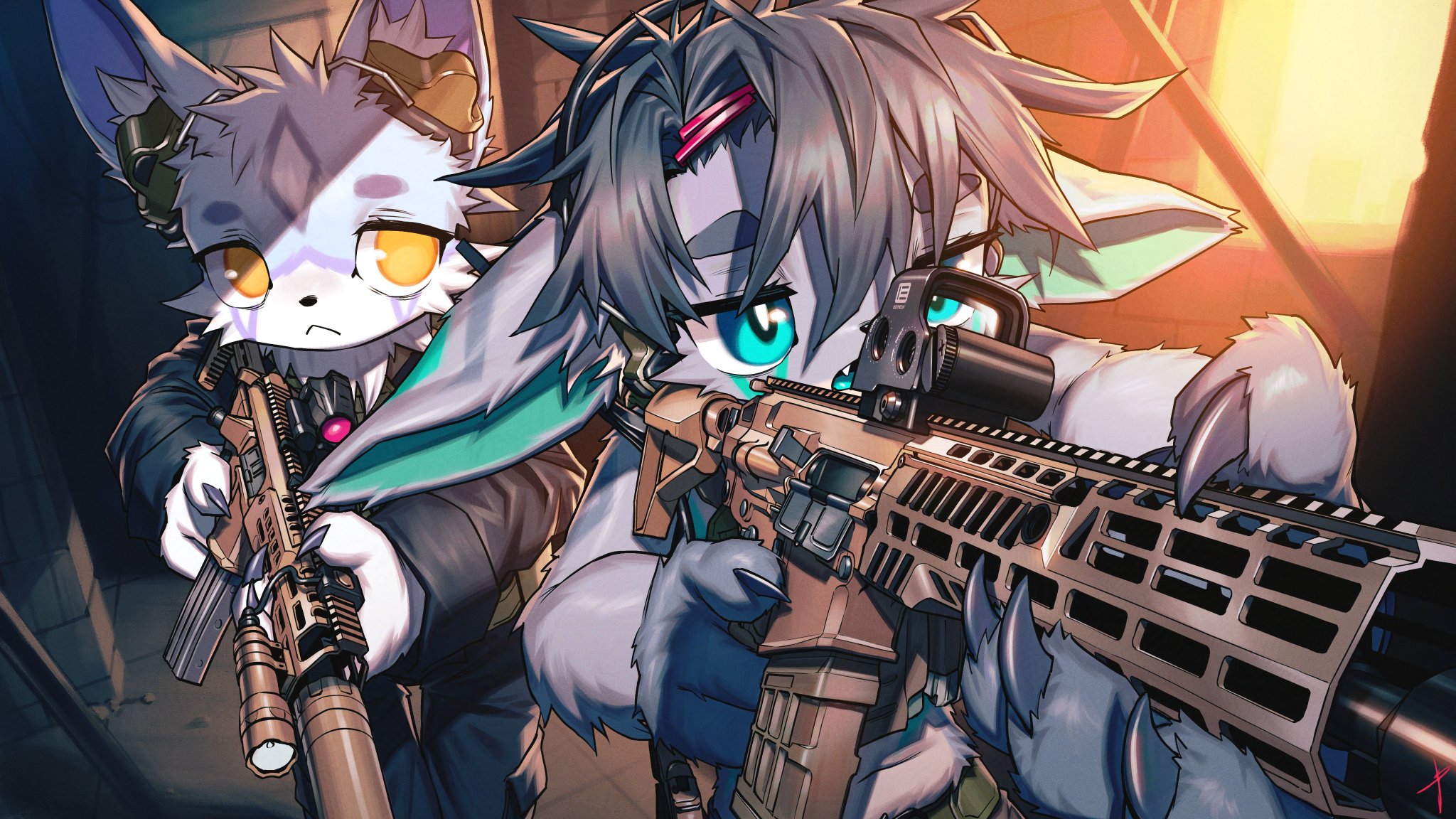 2boys aiming ammunition animal_ears animal_nose aqua_eyes assault_rifle blaedic body_fur bright_pupils claws commission earpiece ears_down fang foreshortening fox_boy fox_ears furry furry_male gun hair_ornament hairclip highres holding holding_gun holding_weapon looking_through_scope male_focus multiple_boys open_mouth original rifle rifle_cartridge scope short_hair sig_mcx thick_eyebrows weapon white_pupils yellow_eyes