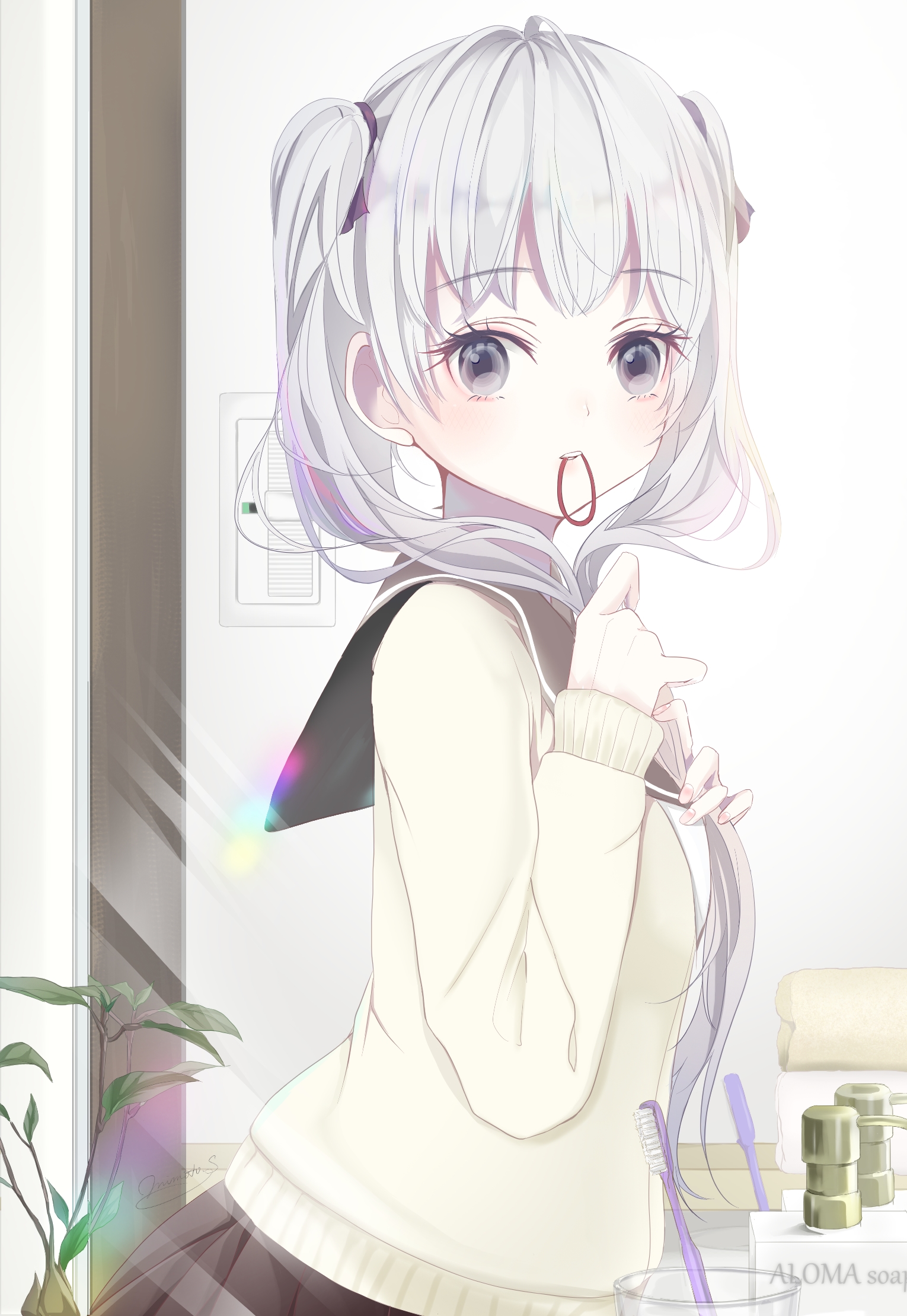 1girl artist_name black_skirt cardigan grey_eyes grey_hair hair_tie_in_mouth highres indoors light_switch long_hair mimoto_s mirror mouth_hold original school_uniform serafuku skirt soap_dispenser solo toothbrush twintails very_long_hair