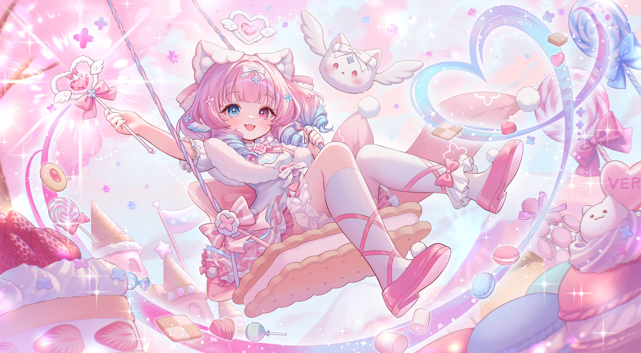 1girl :3 animal_ears arm_up asymmetrical_legwear bad_link blue_hair blunt_bangs blurry bow cake candy castle cat_ears child commission creature day depth_of_field dessert fake_animal_ears food foot_dangle full_body fur_collar gradient_hair hair_bow hand_up happy heart heart_wand heterochromia highres hiiragisoyogi holding holding_wand indie_virtual_youtuber jacket kneehighs konpeitou lens_flare light_blush lollipop looking_at_viewer macaron marshmallow mascot multicolored_hair on_swing open_mouth outdoors pastel_colors pink_hair pink_shoes pom_pom_(clothes) pom_pom_footwear puffy_short_sleeves puffy_sleeves red_eyes ringlets second-party_source shirt shoes short_sleeves sitting sky sleeveless sleeveless_jacket socks solo strawberry_shortcake swing swirl_lollipop vera_(vtuber) wand white_jacket white_shirt white_socks yume_kawaii