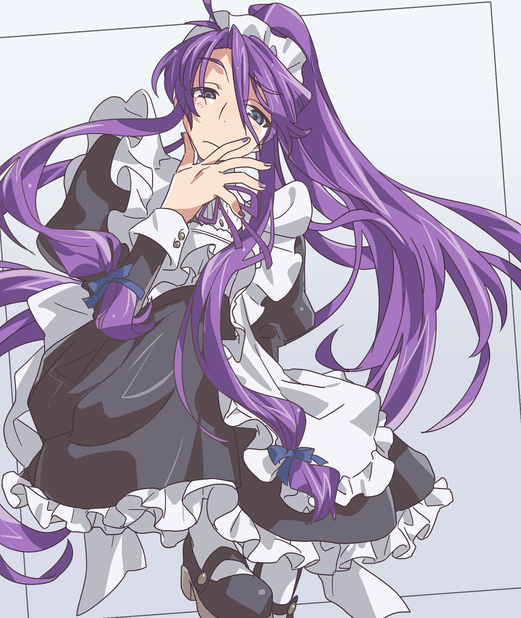 1boy ahoge alternate_costume apron back_bow black_dress black_shoes blue_bow blue_eyes blush bow closed_mouth covering_own_mouth crossdressing crossdressing_(mtf) dress enmaided eyes_visible_through_hair foot_out_of_frame frilled_apron frilled_dress frills frown grey_background hair_between_eyes hair_bow hand_over_own_mouth high_ponytail highres juliet_sleeves kamui_gakupo kirinoha knee_up long_dress long_hair long_sidelocks long_sleeves looking_at_viewer low-tied_sidelocks maid maid_headdress male_focus male_maid mary_janes nail_polish neck_ribbon ponytail puffy_sleeves purple_hair purple_nails purple_ribbon ribbon shoes sidelocks simple_background sleeve_cuffs socks solo very_long_hair very_long_sidelocks vocaloid white_apron white_bow white_socks