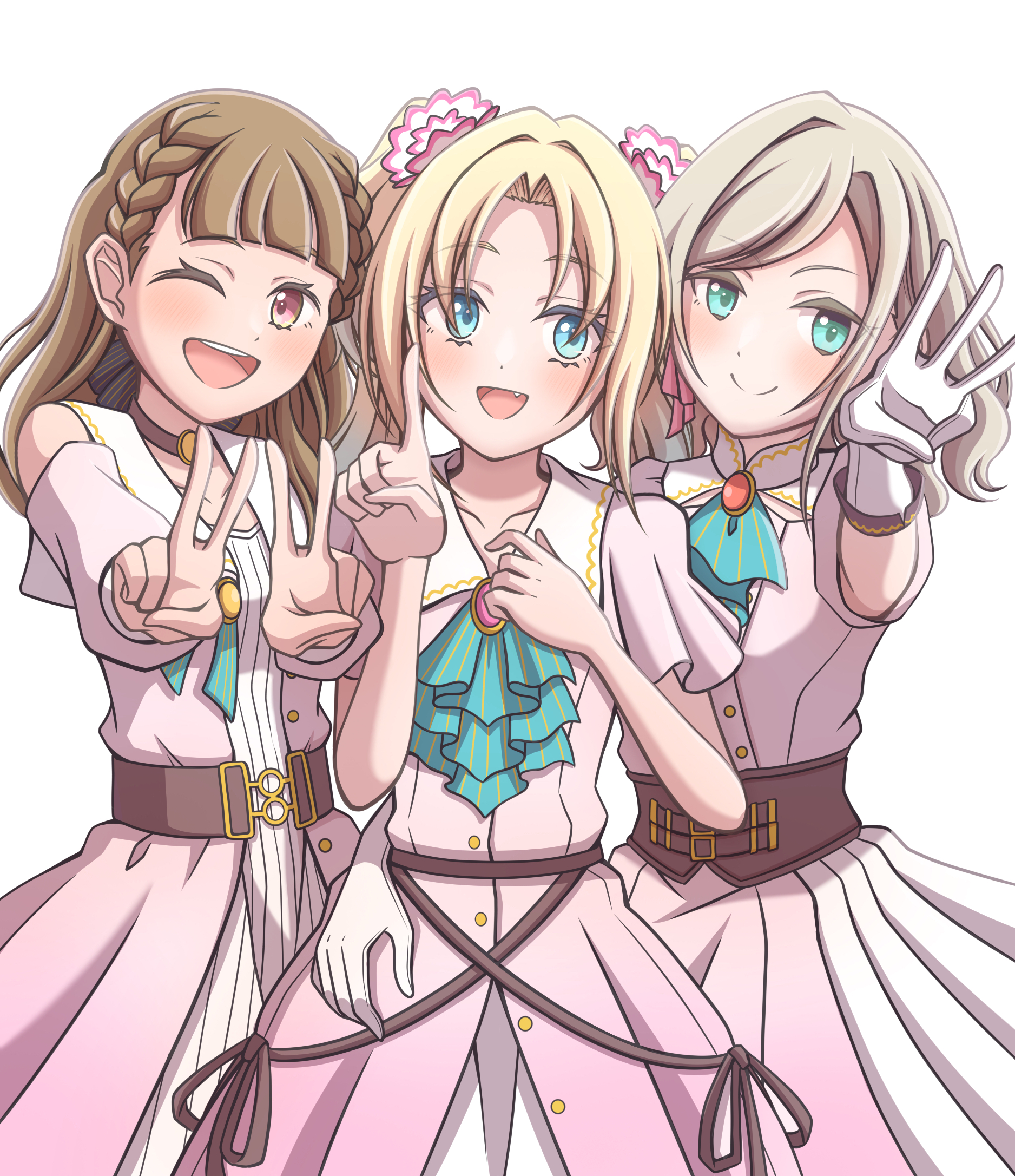 3girls ;d aqua_ascot aqua_eyes ascot bare_shoulders blonde_hair blue_eyes braid brown_hair center-flap_bangs ceras_yanagida_lilienfeld clothing_cutout coat_dress collarbone commentary_request cowboy_shot curtained_hair double_v dream_believers dress elbow_gloves fang finger_counting flower fold-over_gloves ganbarai gloves grey_hair hair_flower hair_ornament hair_ribbon highres ichigo_123_(love_live!) index_finger_raised kachimachi_kosuzu link!_like!_love_live! long_sleeves looking_at_viewer love_live! middle_w multiple_girls official_alternate_costume one_eye_closed open_mouth osawa_rurino parted_bangs pink_dress pink_eyes pink_flower pink_ribbon pleated_dress puffy_long_sleeves puffy_sleeves ribbon short_sleeves shoulder_cutout side_braids simple_background smile twintails v virtual_youtuber w wavy_hair white_background white_gloves