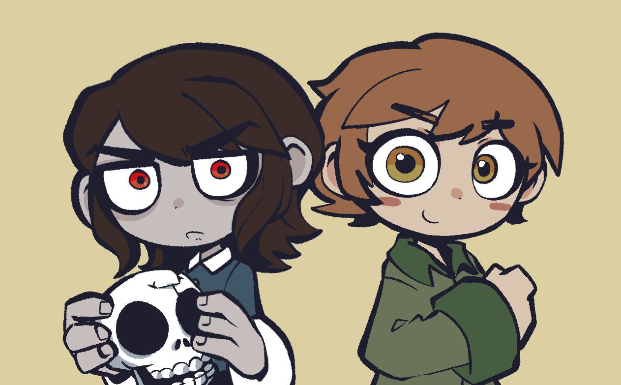 1boy 1girl abaddon_(haunted_hotel) blue_coat bow brown_hair coat commentary_request esther_freeling estherart0 green_coat haunted_hotel holding holding_skull korean_commentary lua43_f red_eyes short_hair simple_background skull upper_body yellow_bow yellow_eyes