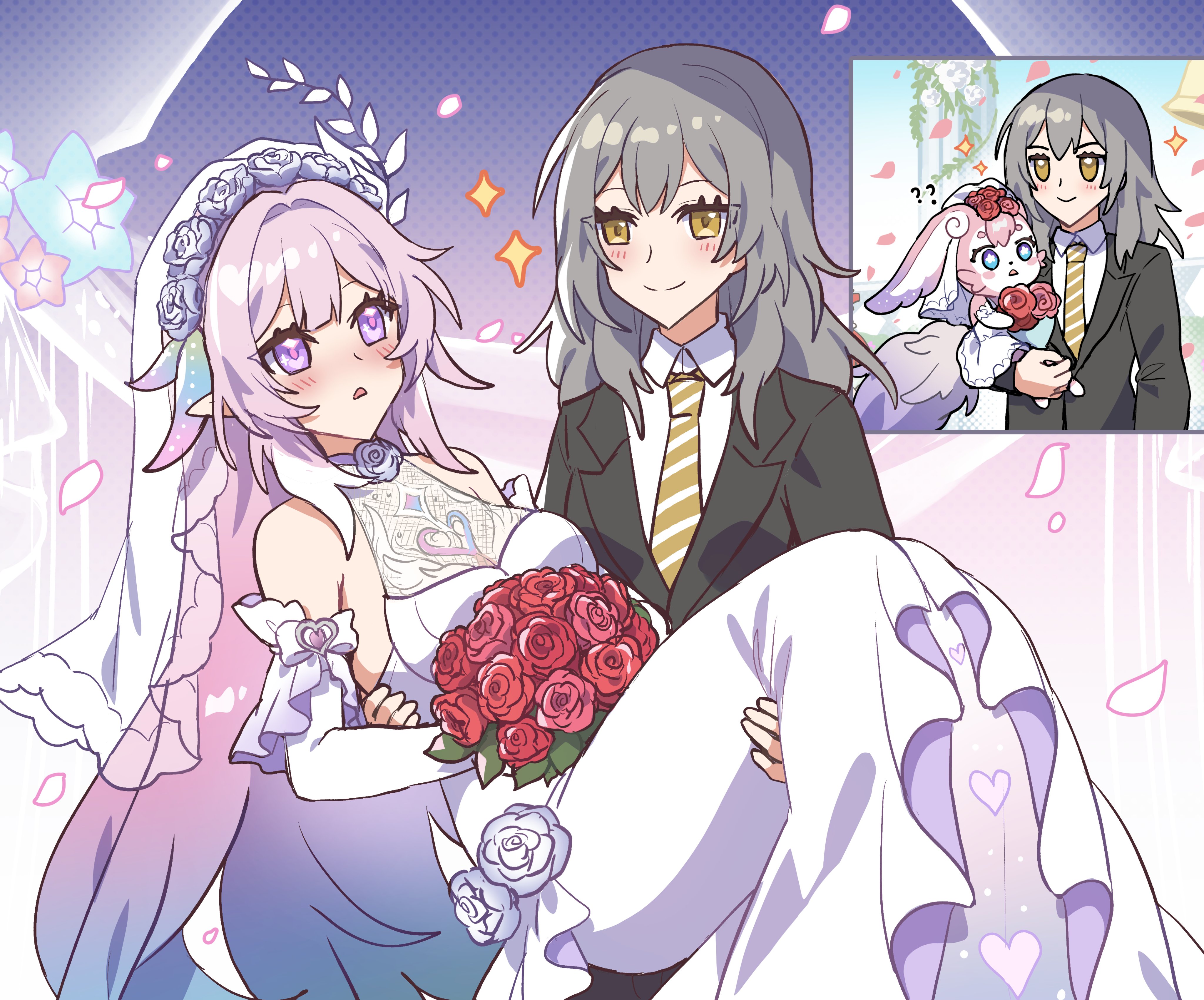 2girls ? ?? absurdres adapted_costume alternate_costume animal_ears bare_shoulders black_jacket blue_eyes blue_hair blush blush_stickers bouquet bow breasts bridal_veil bride carrying closed_mouth collared_shirt confused creature curtains cyrene_(honkai:_star_rail) cyrene_(demiurge)_(honkai:_star_rail) dress elbow_gloves female_focus flower formal_clothes gloves gradient_background gradient_hair grey_hair groom hair_between_eyes hair_ornament hair_ribbon hands_up head_wreath heart heart_print highres holding holding_bouquet honkai:_star_rail honkai_(series) inset jacket lapels leaf leaf_hair_ornament long_hair long_sleeves looking_at_another medium_breasts mem_(honkai:_star_rail) multicolored_hair multiple_girls multiple_views necktie official_alternate_hairstyle open_mouth petals pink_background pink_fur pink_hair pink_pupils pointy_ears polka_dot polka_dot_background princess_carry purple_background purple_eyes red_flower red_rose ribbon rose sakana_(fishchunk) see-through_clothes see-through_veil shirt sidelocks smile sparkle star-shaped_pupils star_(symbol) stelle_(honkai:_star_rail) streaked_hair striped_necktie symbol-shaped_pupils trailblazer_(honkai:_star_rail) two-tone_background veil wedding_dress white_bow white_dress white_flower white_gloves white_hair white_ribbon white_rose white_shirt white_veil wife_and_wife yellow_eyes yellow_necktie yuri