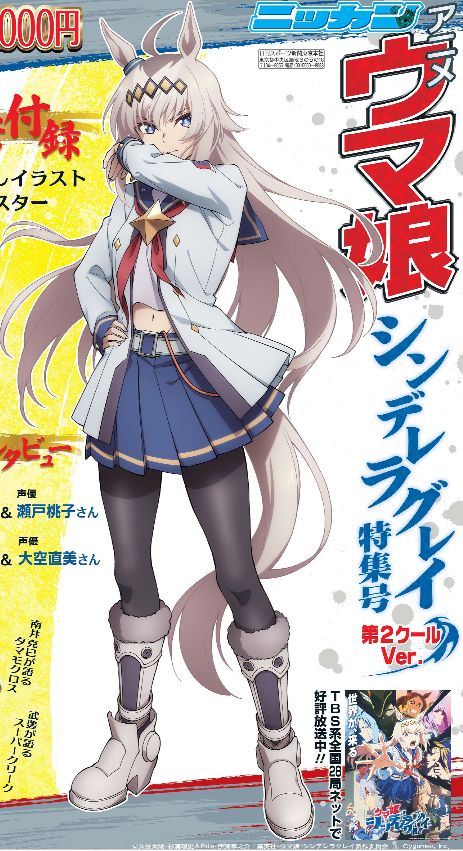 1girl absurdres ahoge animal_ears belt black_hair black_pantyhose blue_eyes blue_sailor_collar blue_skirt boots breasts closed_mouth cropped ear_ornament female_focus full_body grey_belt grey_boots grey_hair grey_tail hand_on_own_hip highres horse_ears horse_girl horse_tail japanese_text long_hair long_sleeves looking_at_viewer midriff miniskirt multicolored_hair navel neckerchief oguri_cap_(starlight_beat)_(umamusume) oguri_cap_(umamusume) pantyhose pleated_skirt racing_suit red_neckerchief sailor_collar scan school_uniform serafuku sexually_suggestive skirt small_breasts stomach sweat sweatdrop tail translation_request two-tone_hair umamusume umamusume:_cinderella_gray very_long_hair white_serafuku wiping_face wiping_sweat