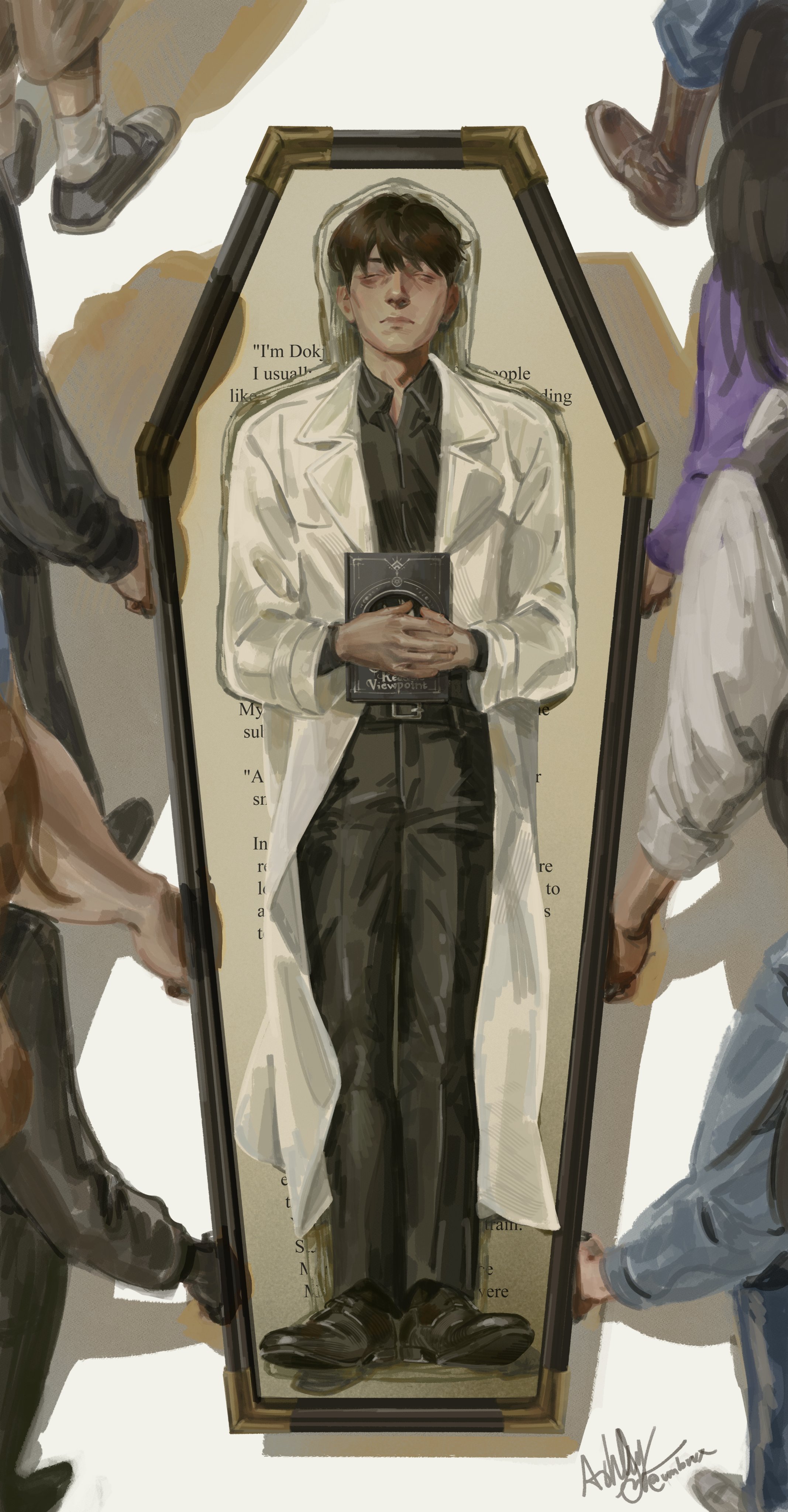 1boy 6+others absurdres black_hair black_shirt book carrying character_request check_character closed_eyes coat coffin collared_shirt commentary corpse english_commentary english_text from_above full_body han_sooyoung hand_on_own_stomach highres holding jung_heewon kim_dokja lee_gilyoung lee_hyunsung lee_jihye lying multiple_others official_art_inset omniscient_reader's_viewpoint on_back open_clothes open_coat out_of_frame shin_yoosung shirt short_hair umbrvx white_coat yoo_joonghyuk yoo_sangah