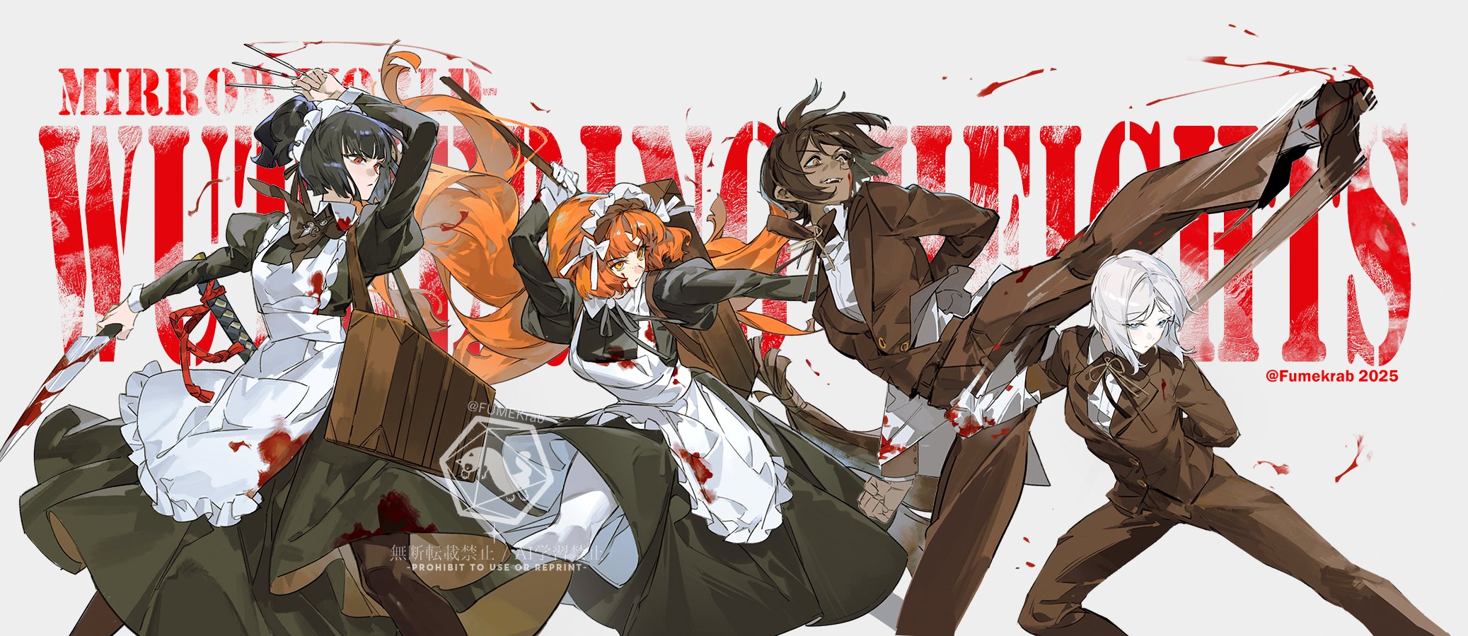 2025 4girls :/ apron arm_behind_back bag between_fingers black_dress black_hair black_pantyhose black_ribbon blood blood_on_clothes bloody_weapon blue_eyes bow broom brown_bag brown_hair brown_hairband brown_jacket brown_pants brown_ribbon brown_shoes butler clenched_hand collared_dress collared_shirt commentary dark-skinned_female dark_skin dress english_commentary faust_(project_moon) female_butler fighting_stance floating_hair frilled_hairband frills hairband hand_up highres holding holding_broom holding_knife ishmael_(project_moon) jacket juliet_sleeves kicking knife knives_between_fingers krab_(fumekrab) limbus_company long_dress long_hair long_sleeves looking_to_the_side maid medium_hair monocle multiple_girls neck_ribbon orange_eyes orange_hair outis_(project_moon) pants pantyhose ponytail project_moon puffy_sleeves red_eyes ribbon ryoshu_(project_moon) serious shirt shoes short_hair shoulder_bag smile text_background throwing_knife twitter_username watermark weapon white_apron white_background white_bow white_hair white_pantyhose white_shirt wuthering_heights_(identity)_(project_moon)