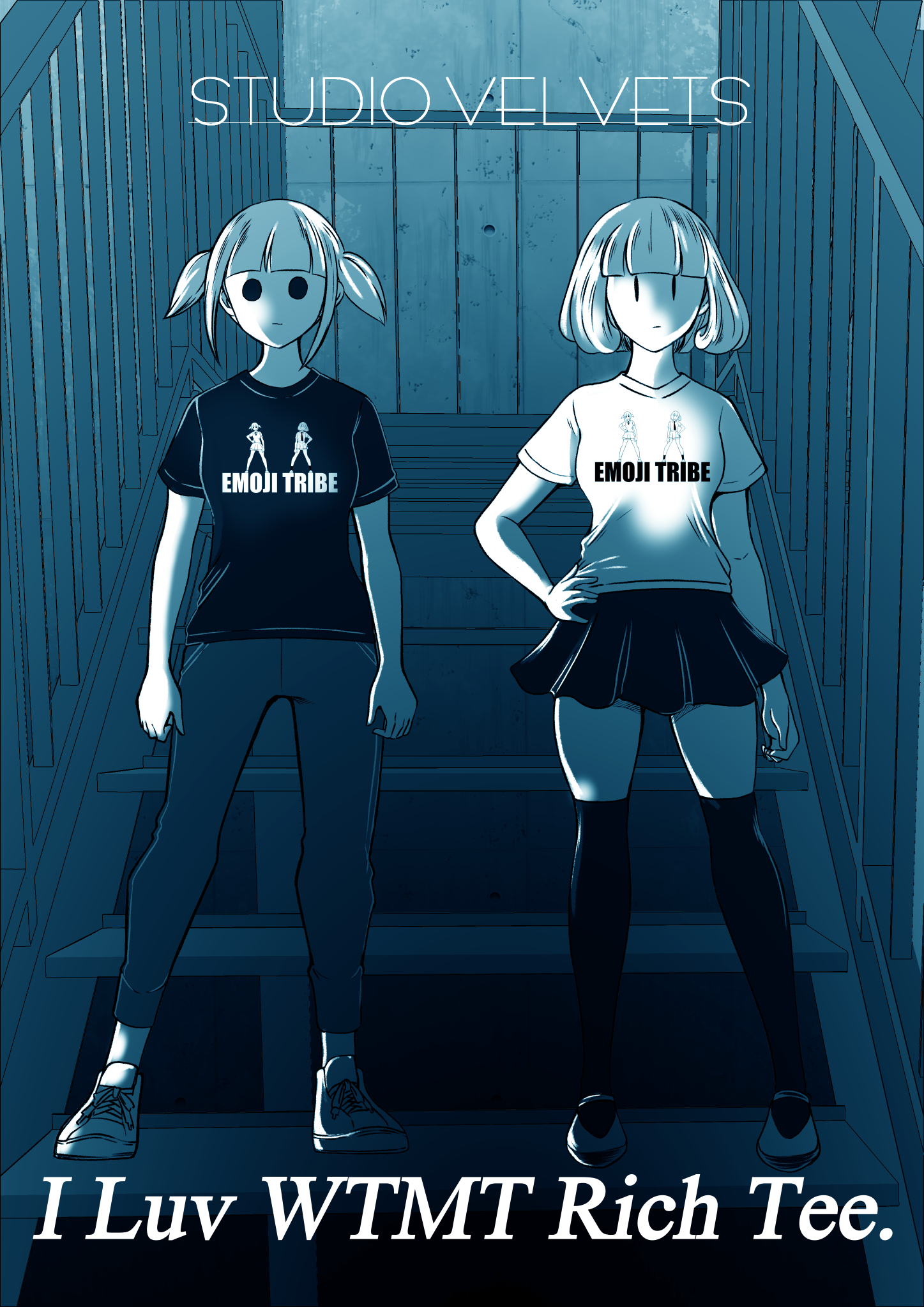 2girls blunt_bangs bob_cut breasts commentary_request english_text futaki_shiki highres limited_palette medium_breasts multiple_girls nakano_hitomi pants pleated_skirt shirt shoes skirt sneakers solid_circle_eyes stairs sweatpants swimsuit t-shirt thighhighs twintails uchi_emiri watashi_ga_motenai_no_wa_dou_kangaetemo_omaera_ga_warui! zettai_ryouiki