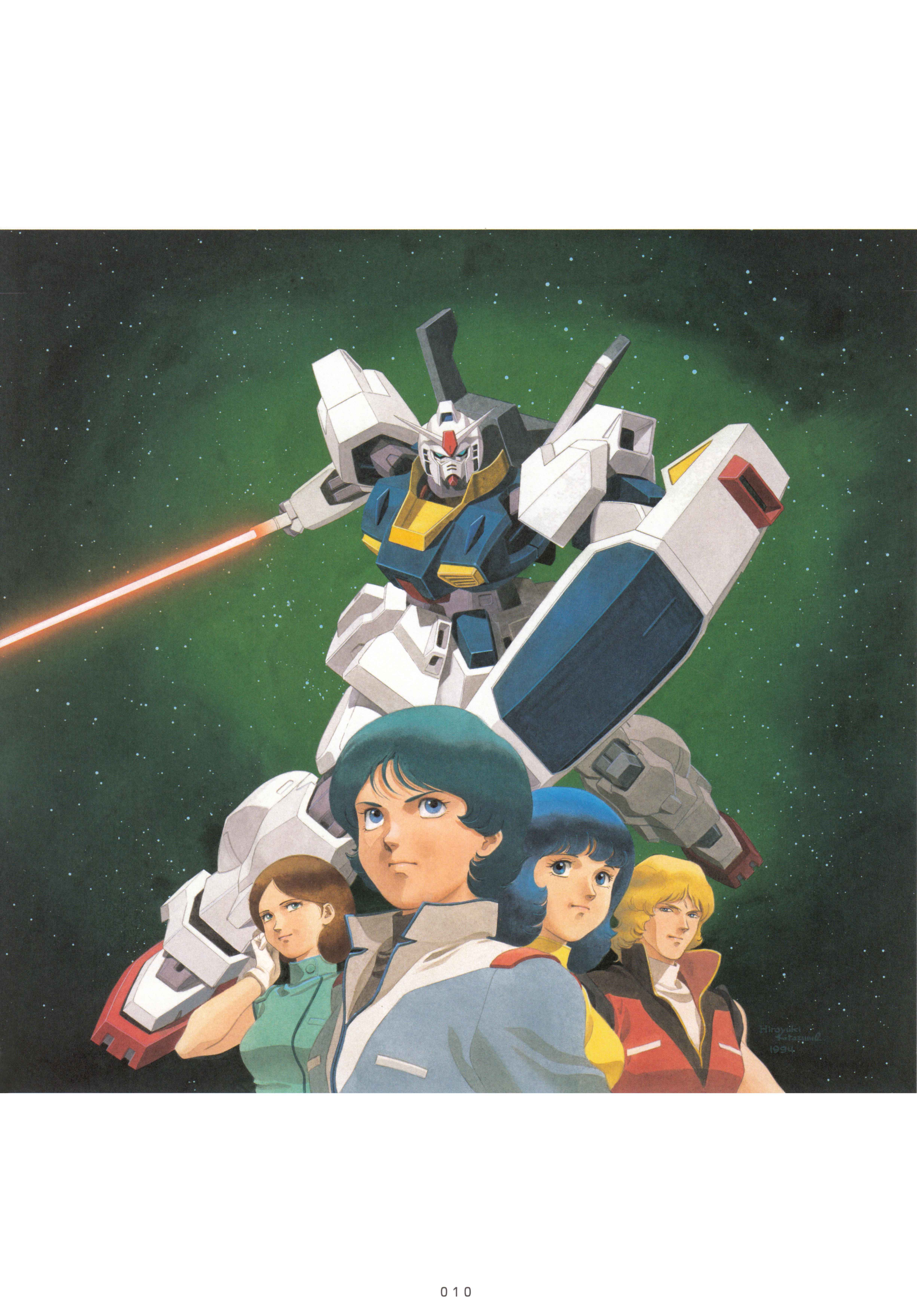 2boys 2girls absurdres aeug bare_shoulders blonde_hair blue_eyes blue_hair brown_hair char_aznable emma_sheen energy_sword fa_yuiry gloves green_eyes gundam gundam_mk_ii highres kamille_bidan kitazume_hiroyuki looking_at_viewer machinery mecha military_uniform mobile_suit mullet multiple_boys multiple_girls nebula official_art painting_(medium) quattro_bajeena robot scan science_fiction serious shield space star_(sky) sword traditional_media v-fin vest weapon zeta_gundam zeta_gundam_define