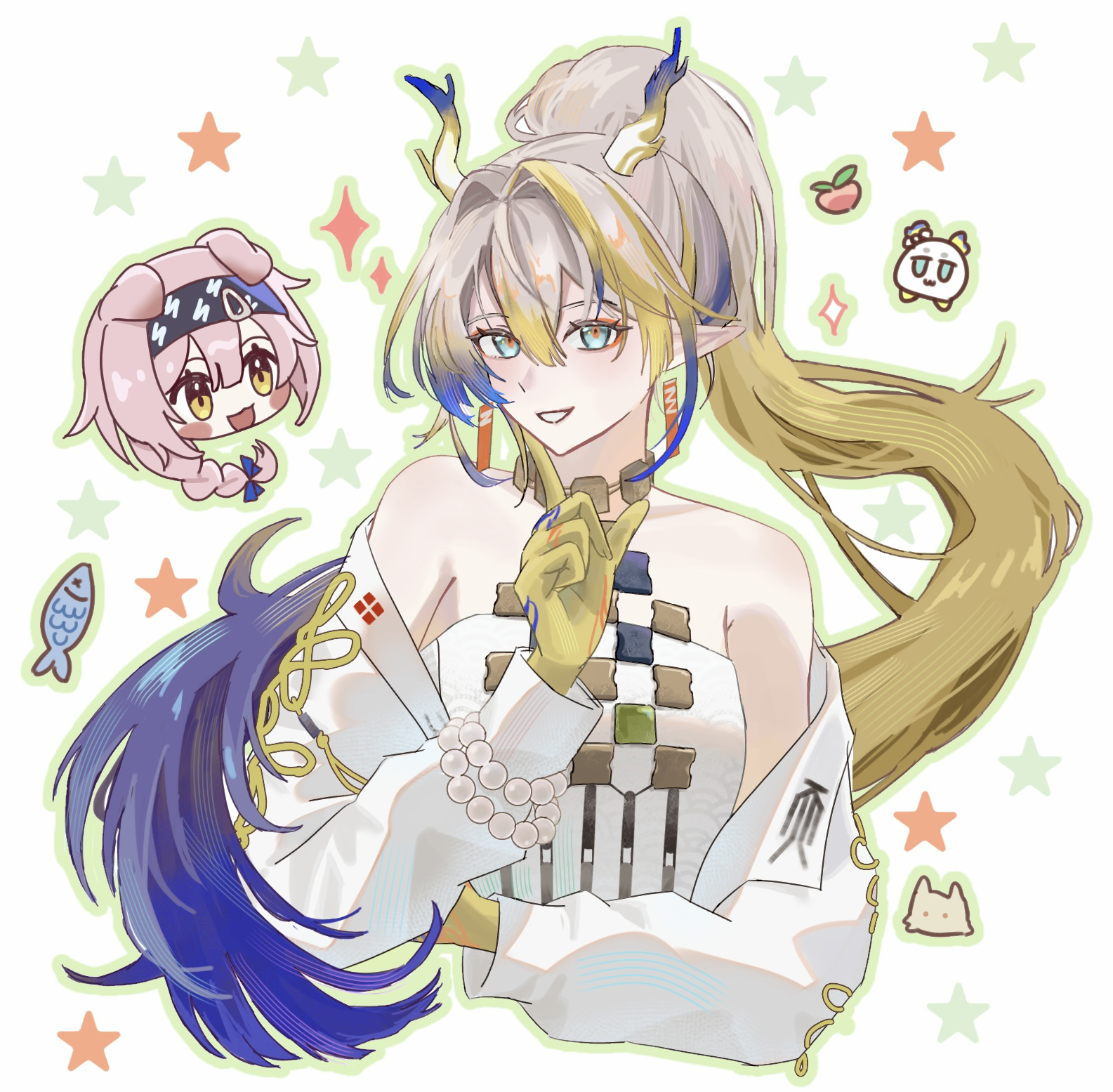 1girl :d alternate_hairstyle aqua_eyes arknights bare_shoulders beads blonde_hair blue_hair chibi chibi_inset colored_extremities commentary cropped_torso dragon_bubble_(arknights) dragon_girl dragon_horns earrings finger_to_cheek goldenglow_(arknights) green_outline grey_hair grin hair_between_eyes hair_intakes highres horns jacket jewelry krgk_sc2 long_hair long_sleeves looking_at_viewer multicolored_hair necklace off_shoulder open_mouth outline pointy_ears ponytail seigaiha shu_(arknights) smile solo sparkle star_(symbol) star_symbol_background strapless tube_top white_background white_jacket white_tube_top