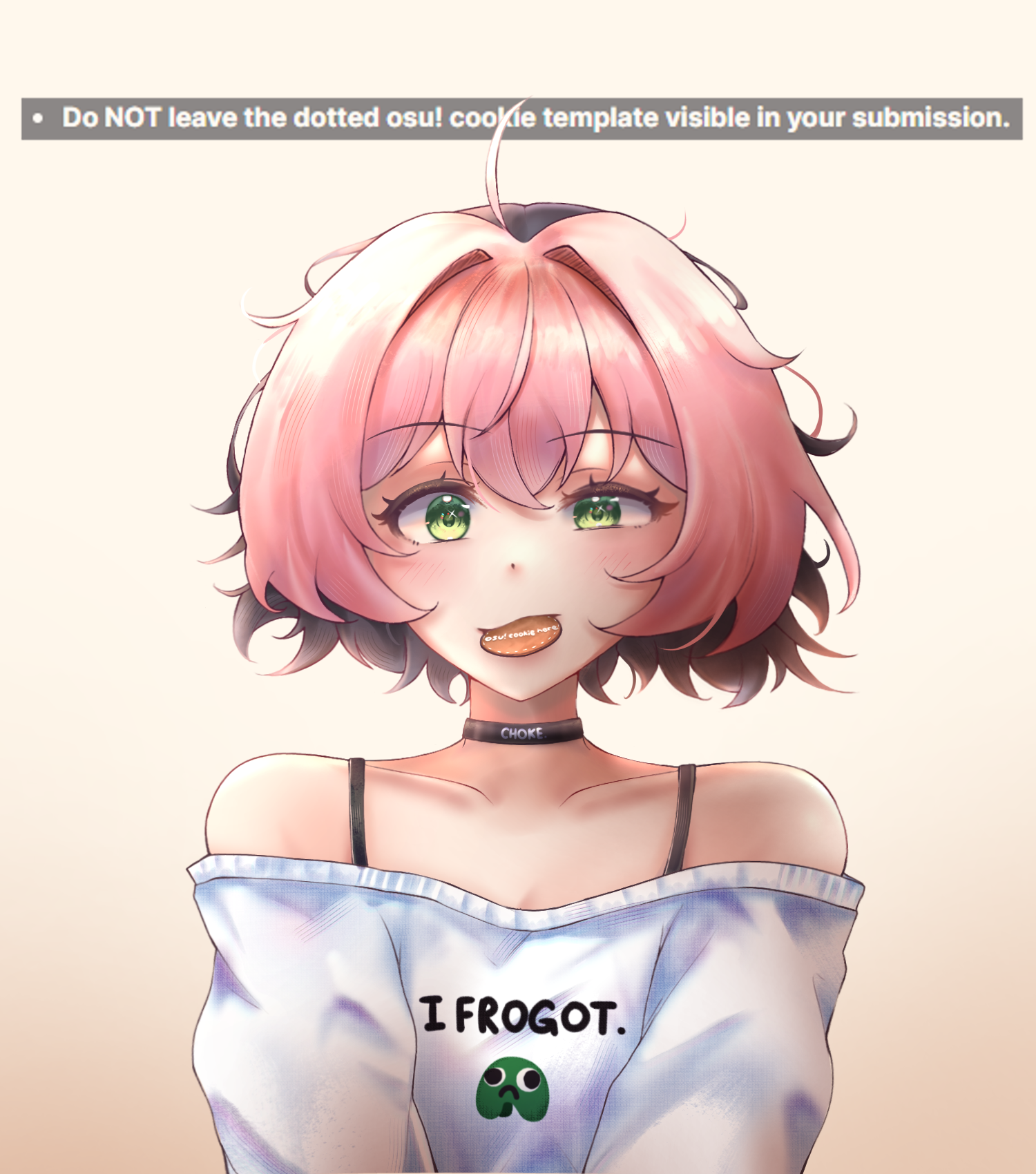 1girl ahoge bare_shoulders black_choker choker clothes_writing collarbone cookie english_text food food_in_mouth green_eyes h3p0 half-closed_eye highres off-shoulder_shirt off_shoulder osu! pink_hair pippi_(osu!) shirt short_hair simple_background solo white_shirt