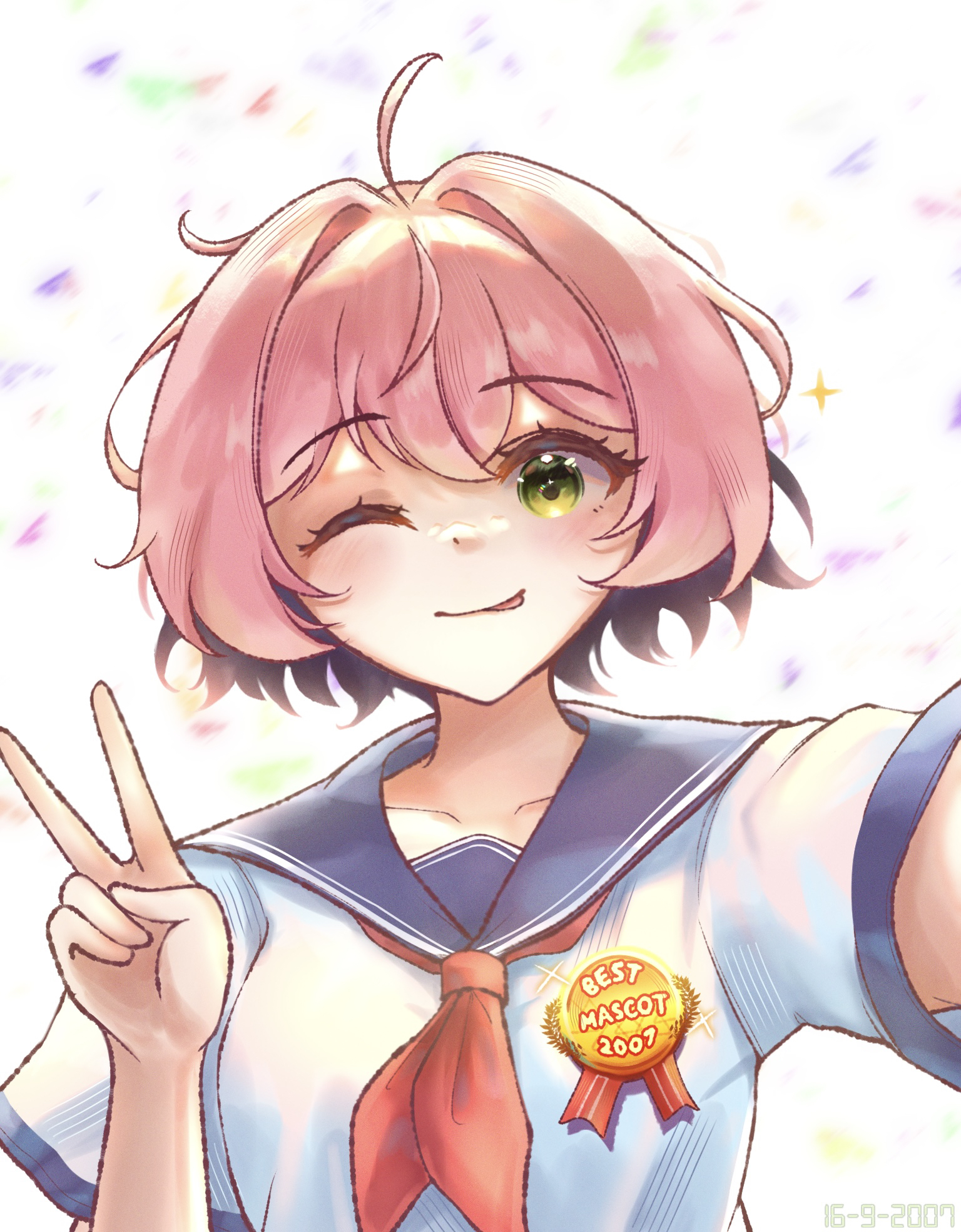 1girl ahoge blue_sailor_collar bow bowtie collarbone commentary dated english_text green_eyes h3p0 highres light_blush looking_at_viewer one_eye_closed osu! pink_hair pippi_(osu!) sailor_collar sailor_shirt school_uniform selfie serafuku shirt short_hair short_sleeves simple_background smile solo tongue tongue_out v white_serafuku