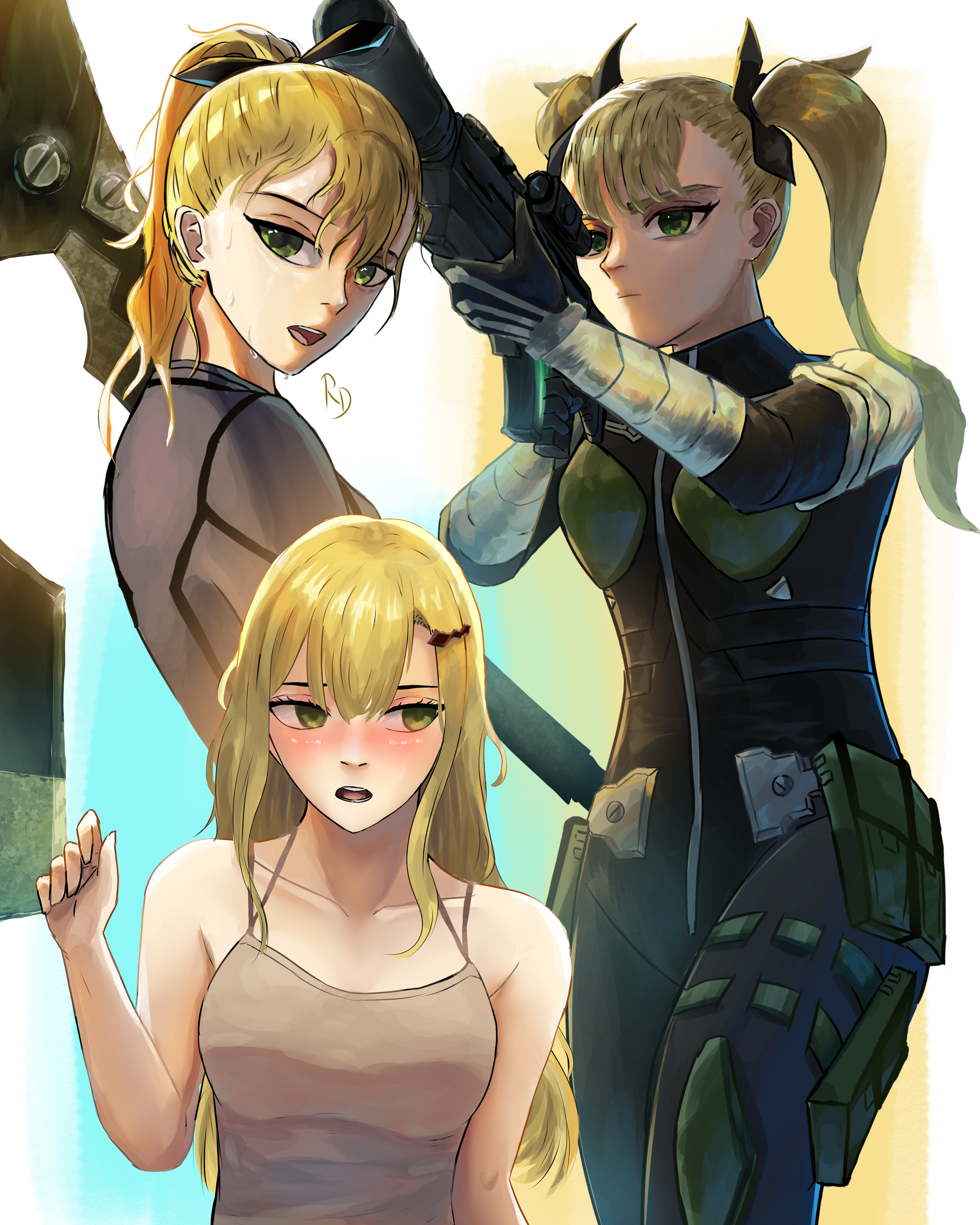 1girl absurdres aiming alternate_hairstyle ammunition_pouch armor axe belt belt_pouch black_bodysuit black_gloves black_ribbon blonde_hair blush bodysuit camisole commentary english_commentary gloves green_eyes grey_camisole gun hair_between_eyes hair_ornament hair_ribbon hairclip highres holding holding_axe holding_gun holding_weapon huge_weapon kaijuu_no._8 long_hair looking_back looking_through_scope looking_to_the_side multiple_views open_mouth over_shoulder ponytail pouch renodude ribbon rifle scope shinomiya_kikoru shoulder_armor sideways_glance signature spaghetti_strap straight_hair sweat thigh_pouch thigh_strap twintails weapon weapon_over_shoulder zipper