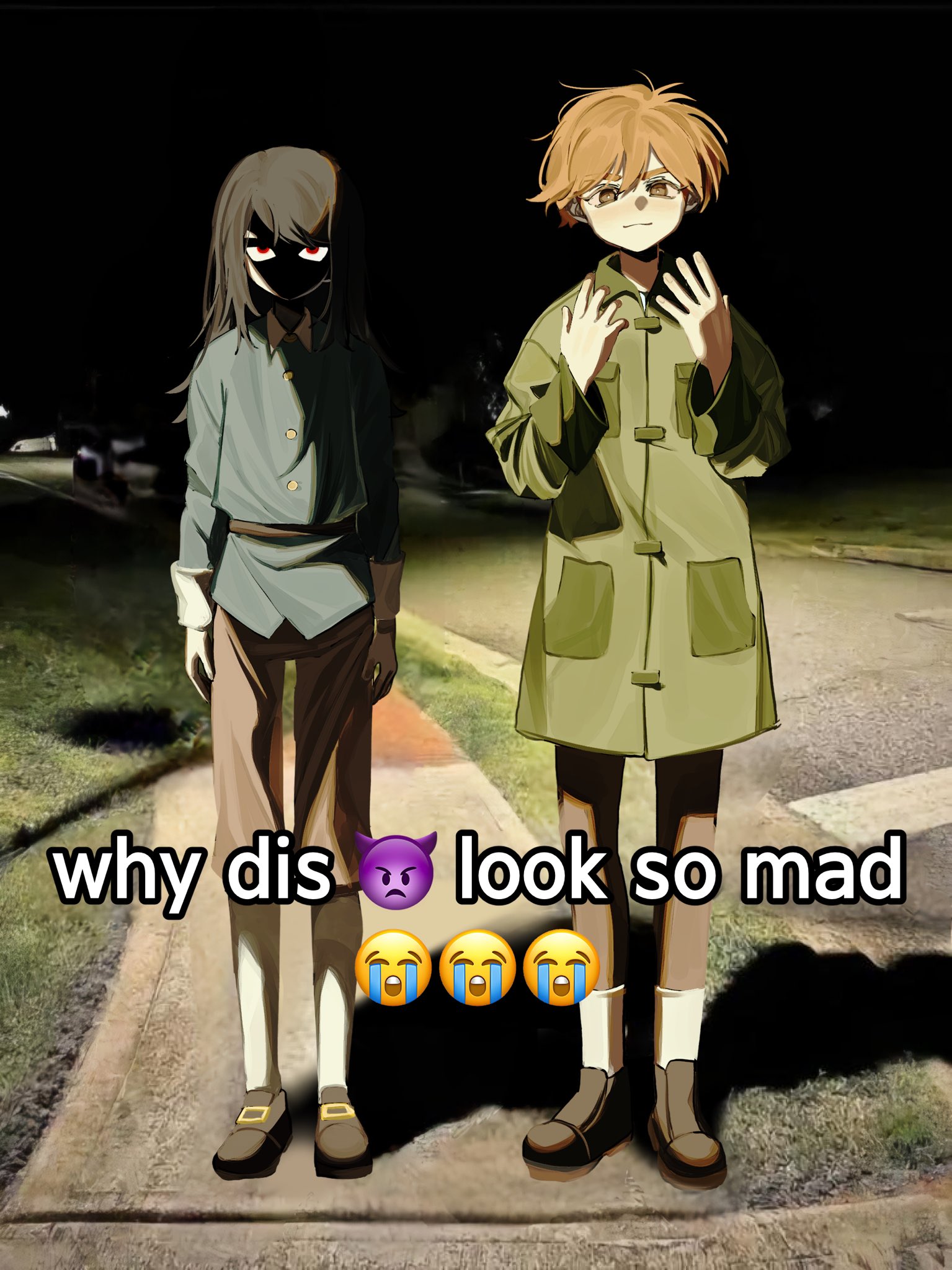 1boy 1girl abaddon_(haunted_hotel) black_hair blue_coat brown_eyes coat english_text esther_freeling green_coat haunted_hotel highres juttan1121 long_hair looking_at_viewer meme night orange_hair outdoors photo_background red_eyes shaded_face short_hair standing why_dis_ninja_look_so_mad_(meme)
