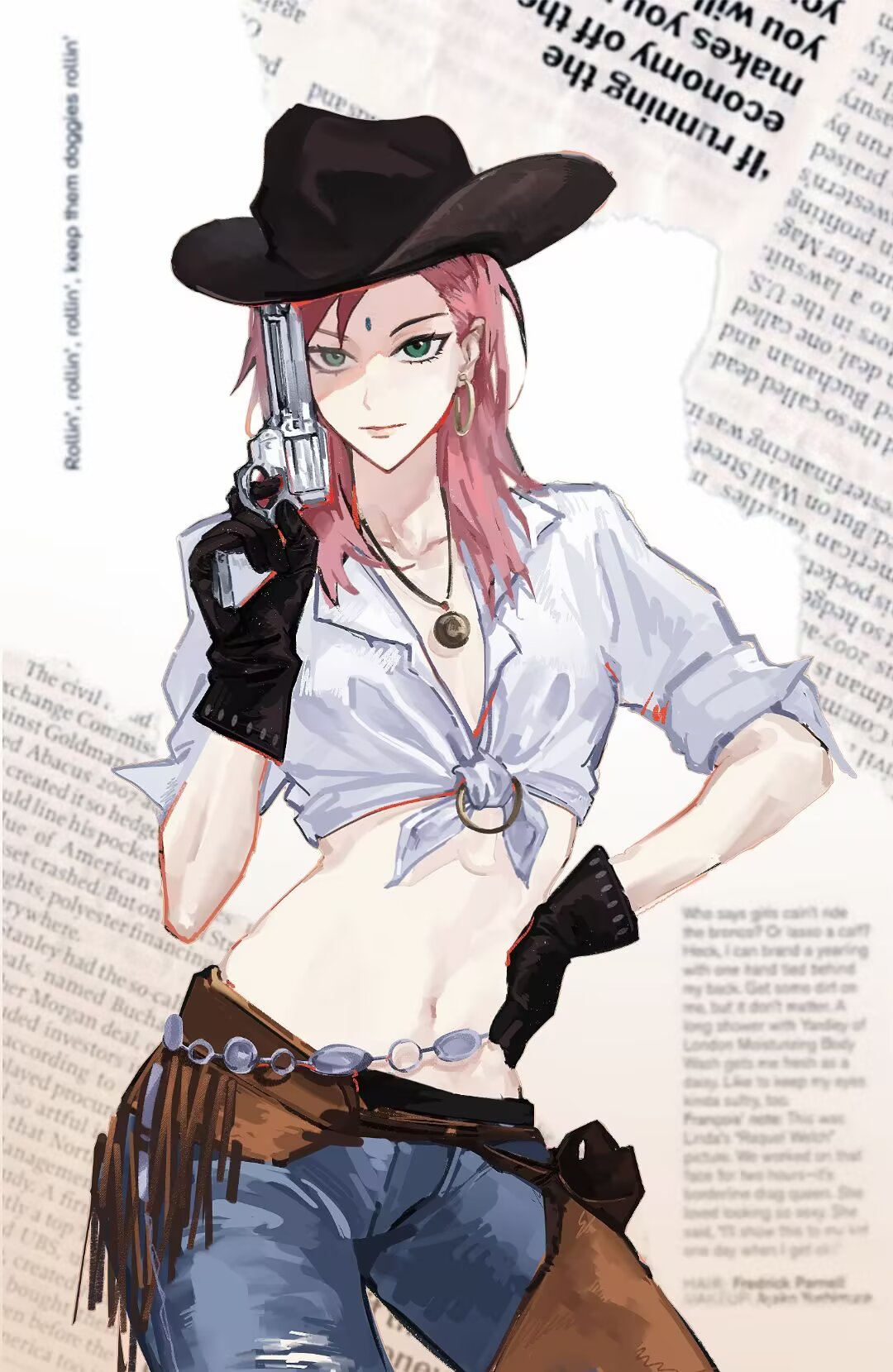 1girl alternate_costume belt black_gloves black_hat blue_pants breasts brown_belt collared_shirt cowboy_hat cowboy_shot denim earrings facial_mark forehead_mark fringe_trim gloves green_eyes gun hand_on_own_hip handgun haruno_sakura hat highres hngbo652804 holding holding_gun holding_weapon hoop_earrings jeans jewelry medium_breasts medium_hair midriff naruto_(series) navel necklace newsprint_background pants pink_hair shirt sleeves_rolled_up solo tied_shirt torn_clothes torn_pants weapon white_shirt