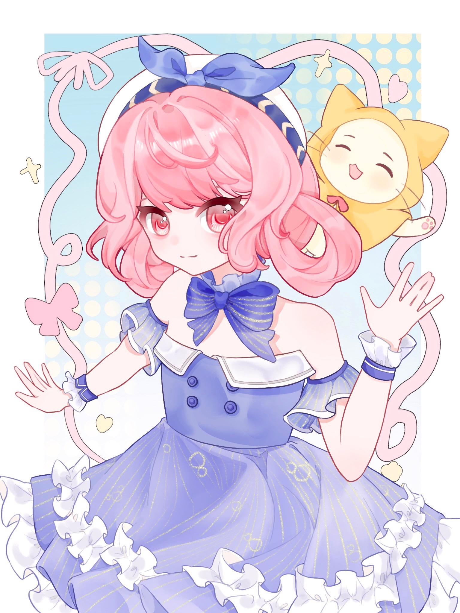 1girl ^_^ animal animal_on_head bare_shoulders beret blue_background blue_bow blue_bowtie blue_choker blue_dress blue_sleeves blue_wrist_cuffs border bow bow_choker bowtie bubble_print bubbly_voyage_(infinity_nikki) buttons cat chinese_commentary choker cloak closed_eyes closed_mouth clothed_animal collared_dress commentary_request cowboy_shot detached_sleeves dress ear_covers eyelashes eyes_visible_through_hair frilled_choker frilled_dress frilled_sleeves frilled_wrist_cuffs frills hair_rings halftone halftone_background happy hat hat_bow heart hebo_(xinjinjumin299393807253) highres hood hood_up hooded_cloak infinity_nikki light_blush loose_hair_strand momo_(nikki) nikki_(nikki) nikki_(series) on_head outside_border picture_frame pink_eyes pink_hair pleated_dress print_dress red_bow red_bowtie short_dress short_hair short_sleeves smile sparkle standing strapless strapless_dress striped_bow striped_bowtie striped_clothes striped_dress traditional_bowtie vertical-striped_clothes vertical-striped_dress vertical-striped_sleeves whiskers white_border white_cat white_hat wrist_cuffs yellow_cloak