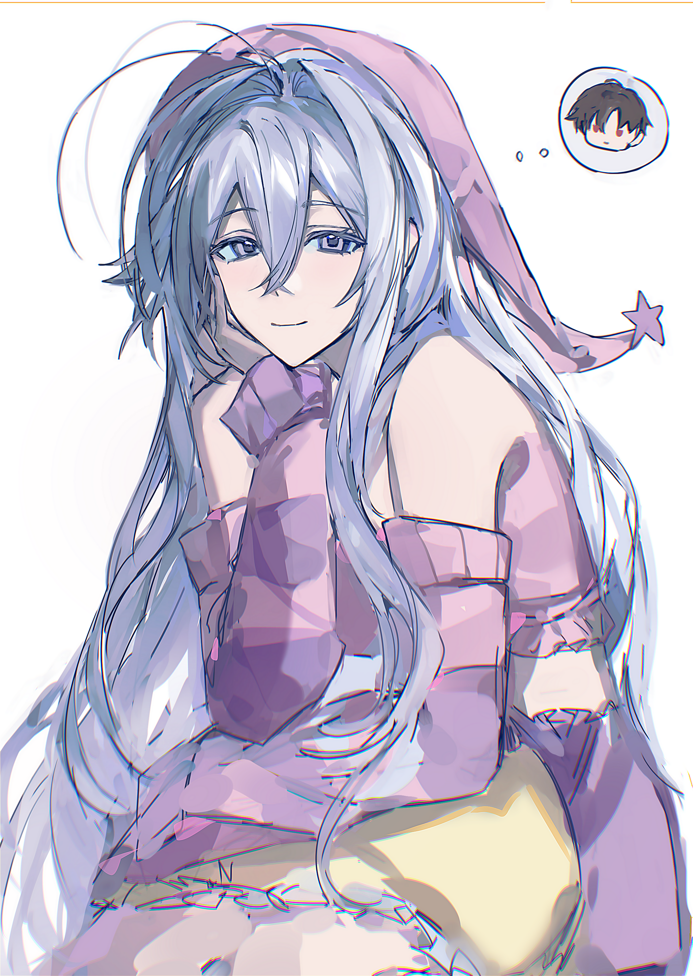 1girl 86_-eightysix- absurdres antenna_hair arm_rest chinese_commentary closed_mouth commentary_request crop_top detached_sleeves double-parted_bangs elbow_rest grey_hair hair_between_eyes hair_intakes hand_on_own_cheek hand_on_own_face hat head_rest highres imagining kuailemaoamaomao^o^ long_hair long_sleeves nightcap object_on_lap pajamas pillow purple_hat purple_pajamas purple_shirt purple_shorts purple_sleeves shinei_nouzen shirt shorts simple_background sitting smile solo speech_bubble striped_sleeves thought_bubble very_long_hair vladilena_millize white_background