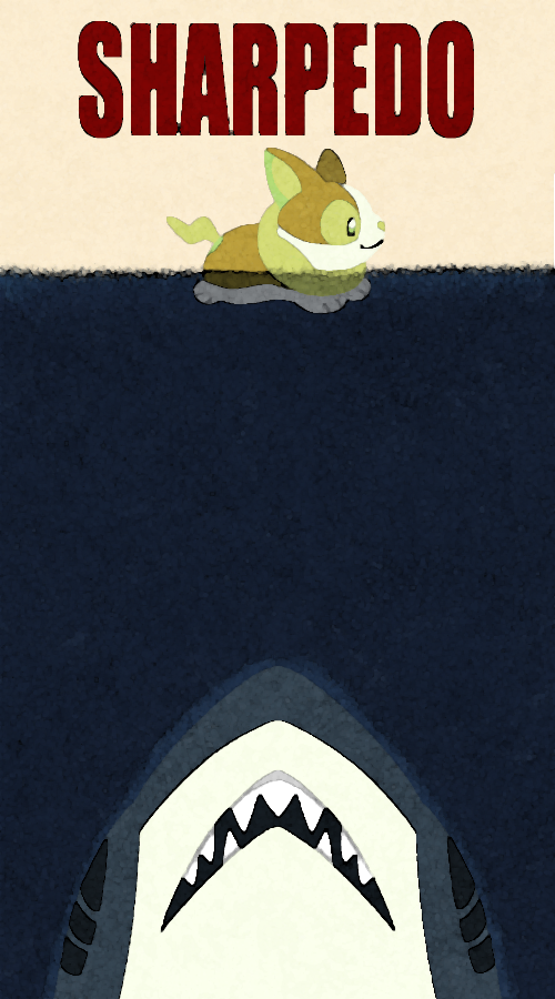 closed_mouth gen_3_pokemon gen_8_pokemon green_eyes jaws_(movie) nintendo no_humans open_mouth parody pokemon pokemon_(creature) satsumapotato sharpedo simple_background swimming teeth water yamper