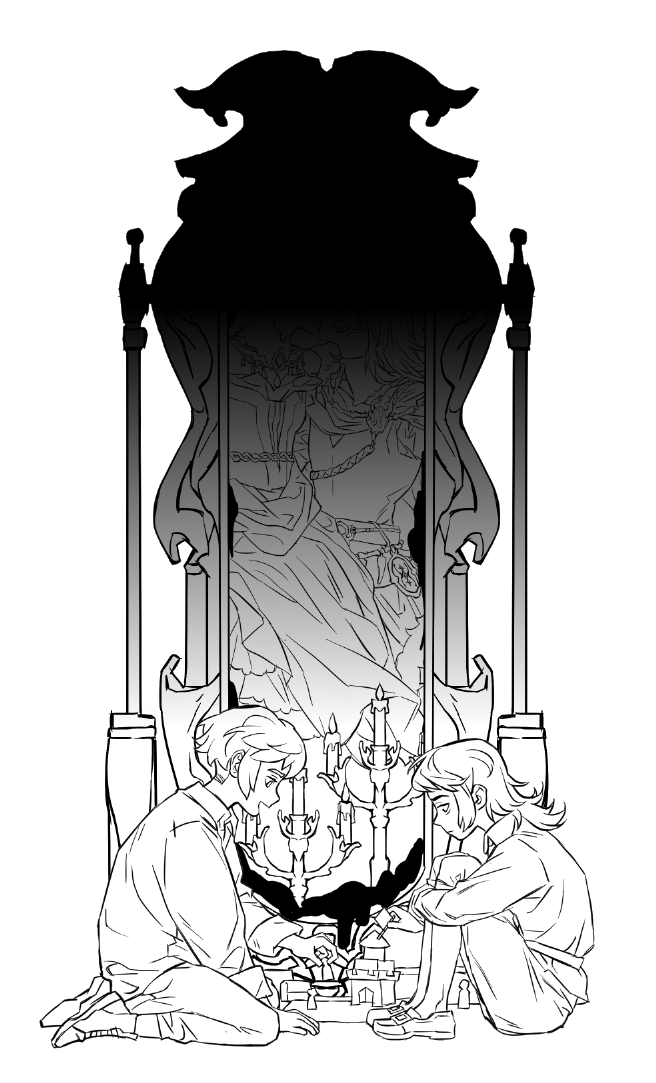 1boy 1girl abaddon_(haunted_hotel) aged_up board_game candle candlestand child coat commentary esther_freeling greyscale haunted_hotel long_hair mirror monochrome repeeksdnuorg short_hair simple_background sitting symbol-only_commentary toy white_background