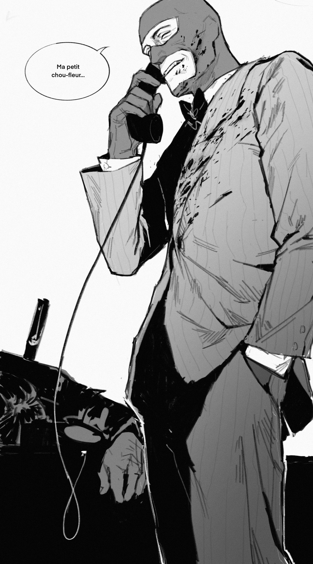 1boy adapted_costume backstab balaclava balisong blood blood_on_clothes blood_on_face bow bowtie commentary corpse english_commentary formal_clothes french_text gloves hand_in_pocket highres holding holding_phone knife knife_in_back male_focus mask monochrome musk8r phone pinstripe_pattern pinstripe_suit solo_focus speech_bubble spy_(tf2) suit team_fortress_2