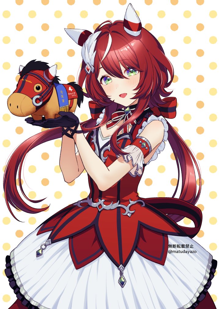 1girl :d animal_ears black_gloves bow cowboy_shot detached_sleeves dress ear_covers feather_hair_ornament feathers gloves green_eyes hair_between_eyes hair_bow hair_ornament hands_up horse_ears horse_girl long_hair low_twintails matuda_(matudayazo) multicolored_hair open_mouth polka_dot polka_dot_background red_bow red_dress red_eyes sleeveless sleeveless_dress smile solo streaked_hair stuffed_animal stuffed_horse stuffed_toy twintails twitter_username umamusume watermark white_hair win_variation_(dramatic_tutu)_(umamusume) win_variation_(racehorse) win_variation_(umamusume)