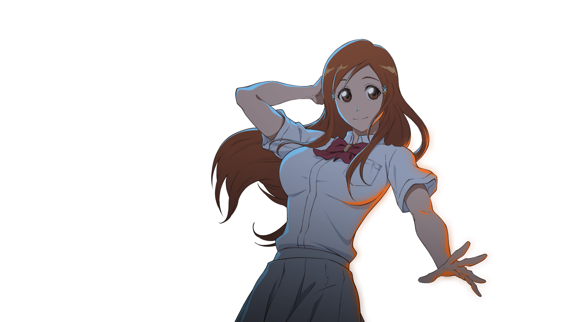 1girl anime_coloring arm_behind_head bleach bleach_soul_resonance bow bowtie breasts brown_eyes brown_hair closed_mouth collared_shirt dress_shirt eyebrows_hidden_by_hair eyelashes floating_hair grey_skirt hair_ornament hairpin highres inoue_orihime karakura_high_school_uniform large_breasts long_hair looking_at_viewer official_art outstretched_hand parted_bangs pleated_skirt red_bow red_bowtie school_uniform shirt short_sleeves sidelocks simple_background skirt smile solo split_mouth tareme transparent_background very_long_hair white_shirt
