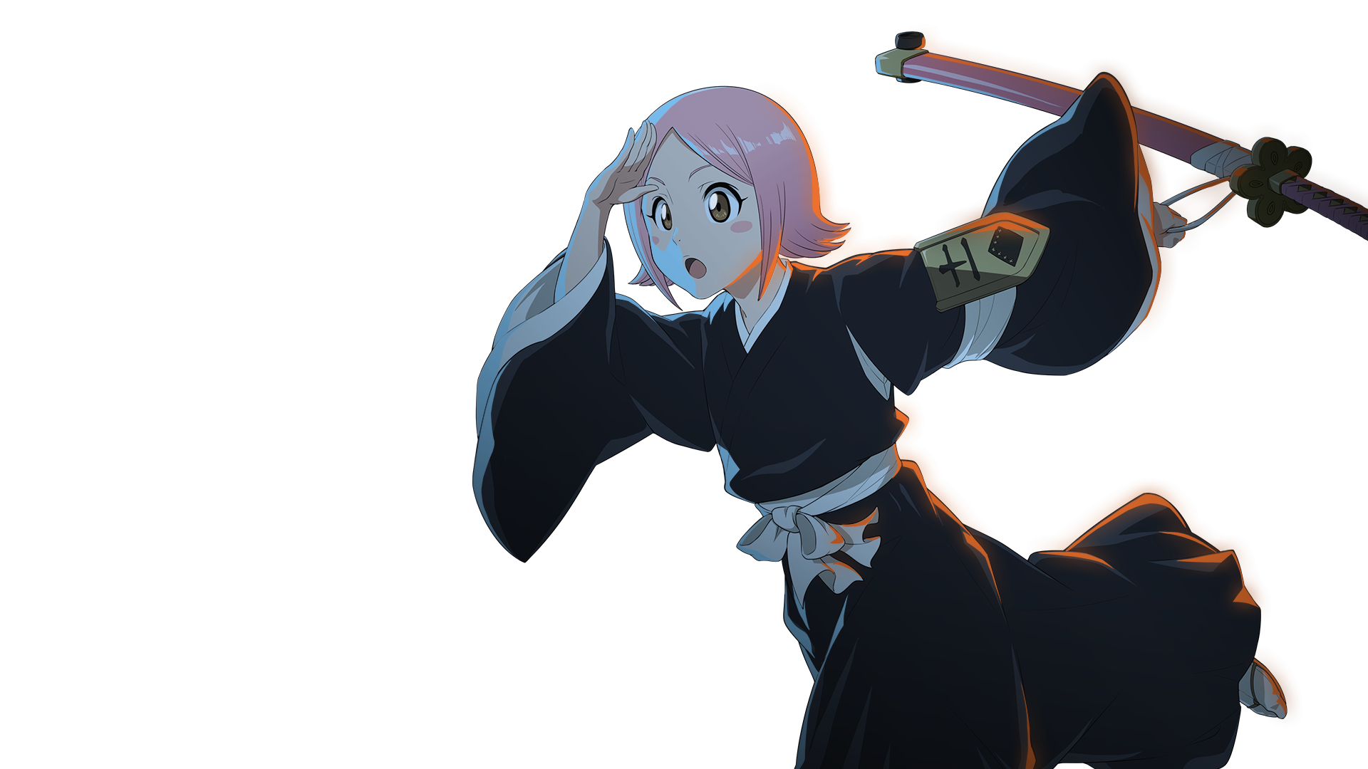 1girl :o anime_coloring arm_up badge black_hakama black_kimono bleach bleach_soul_resonance blush_stickers brown_eyes child flipped_hair foot_out_of_frame forehead fukutaichou_badge hakama highres holding holding_sword holding_weapon japanese_clothes katana kimono kusajishi_yachiru long_sleeves looking_ahead official_art open_mouth parted_bangs pink_hair sash shading_eyes short_hair simple_background solo standing standing_on_one_leg sword tabi tareme transparent_background weapon white_sash wide-eyed wide_sleeves