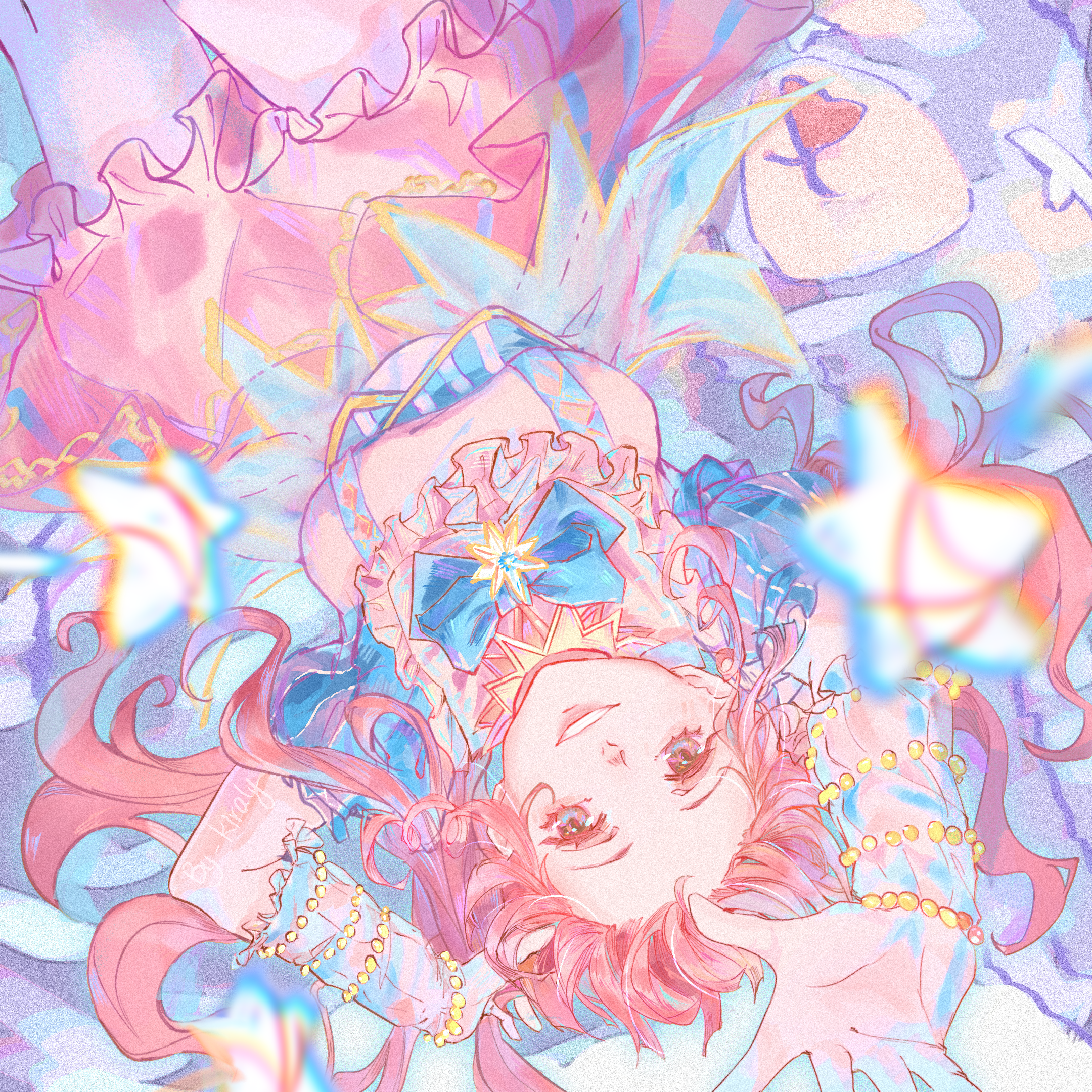 1girl artist_request bead_bracelet beads blue_arm_warmers blue_bow blue_bowtie blue_sleeves bow bowtie bracelet breasts brooch brown_eyes bubble_skirt chinese_commentary commentary_request cowboy_shot eyelashes frilled_arm_warmers frilled_skirt frilled_sleeves frills hand_in_own_hair happy hexagram highres infinity_nikki jewelry layered_skirt lipstick long_hair makeup medium_breasts miniskirt multiple_bracelets nikki_(nikki) nikki_(series) open_mouth pink_hair pink_lips pink_shirt pink_skirt puffy_short_sleeves puffy_sleeves second-party_source shirt short_sleeves skirt smile solo star_(symbol) star_brooch striped_clothes striped_skirt stuffed_animal stuffed_toy suspenders teddy_bear teeth twintails upside-down vertical-striped_clothes vertical-striped_skirt vertical-striped_sleeves wavy_hair whimstar_(infinity_nikki) yarn