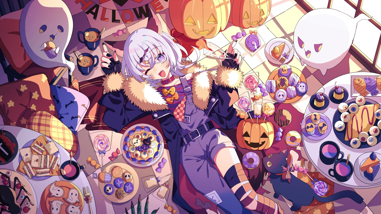 1girl animal animal_collar animal_ears animal_print asymmetrical_clothes bat_hair_ornament bat_print belt black_cat black_nails bow buckle candy cat cat_ears champagne_flute checkered_floor coat collar commission crossed_bangs cup cupcake cushion donut drinking_glass eyeball fang fingerless_gloves fingernails food fork fur-trimmed_coat fur_trim ghost gloves hair_ornament halloween ikarumi_yuzuru indie_virtual_youtuber jack-o'-lantern leg_wrap lollipop long_fingernails lying macaron marshmallow mug omelet on_back on_floor orange_bow overall_shorts overalls pie plate purple_eyes purple_hair skeb_commission taiyaki umesaka_huru virtual_youtuber wagashi webp-to-png_conversion wolf_cut wrapped_candy