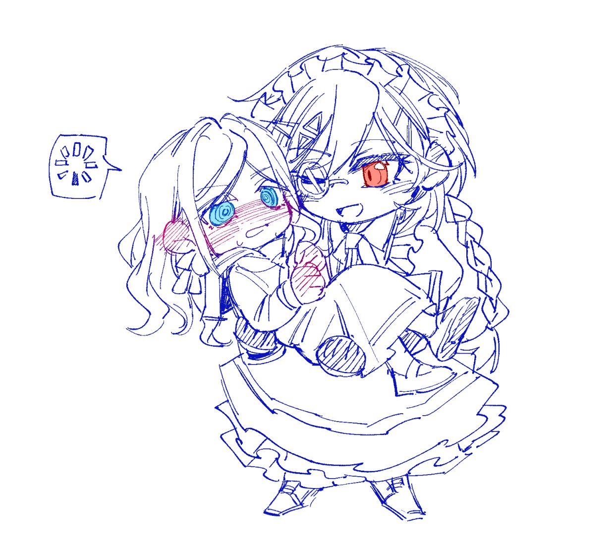 2girls ;d blue_theme blush braid carrying ceras_yanagida_lilienfeld commentary deformed dress embarrassed hair_ornament hair_ribbon hasu_no_sora_school_uniform katsuragi_izumi link!_like!_love_live! loading_icon long_dress long_hair long_sleeves love_live! maid maid_headdress monochrome monocle multiple_girls neckerchief nose_blush official_alternate_costume one_eye_closed open_mouth parted_bangs pleated_dress princess_carry ribbon ringed_eyes sailor_collar sailor_dress school_uniform shoes simple_background single_braid smile spoken_symbol spot_color sweatdrop symbol-only_commentary triangle_hair_ornament virtual_youtuber white_background winter_uniform yrxy_settingsun yuri