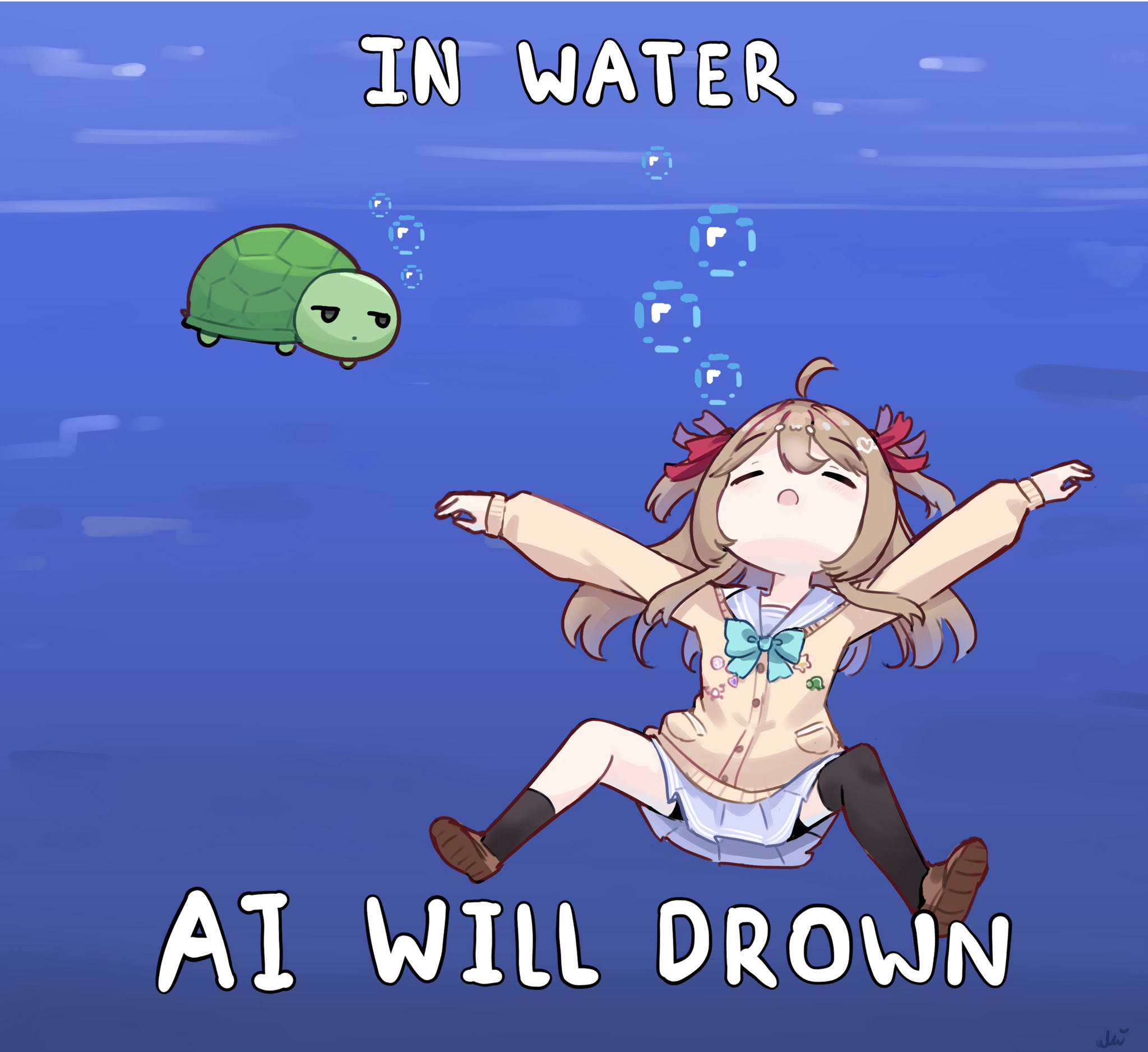1girl ahoge aqua_bow aqua_bowtie asphyxiation asymmetrical_legwear black_shorts black_socks black_thighhighs blue_sailor_collar bow bowtie brown_hair brown_shoes cardigan closed_mouth commentary drowning english_commentary full_body hair_between_eyes hair_ribbon highres long_hair long_sleeves meme minecraft neuro-sama open_mouth red_ribbon ribbon sailor_collar shoes shorts single_sock single_thighhigh socks thighhighs turtle two_side_up ukichan22905846 underwater uneven_legwear vedal987 vedal_ai virtual_youtuber yellow_cardigan