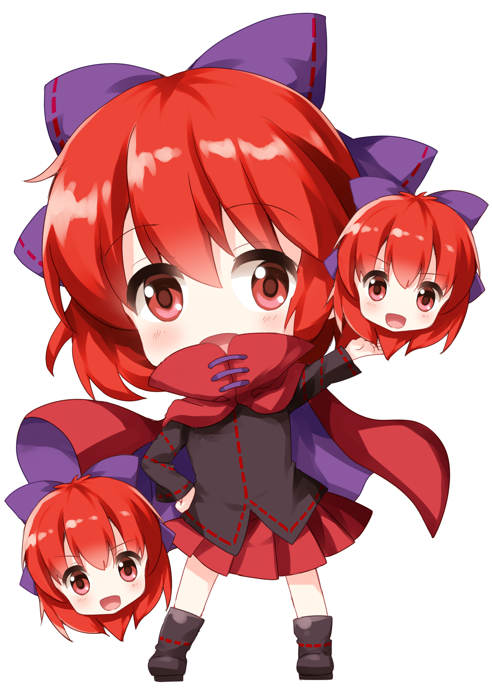 1girl :d black_boots black_shirt boots cape chibi chibi_only hair_between_eyes hair_ribbon highres long_sleeves looking_at_viewer open_mouth purple_ribbon red_cape red_eyes red_hair red_skirt ribbon ruu_(tksymkw) sekibanki shirt short_hair simple_background skirt smile touhou white_background