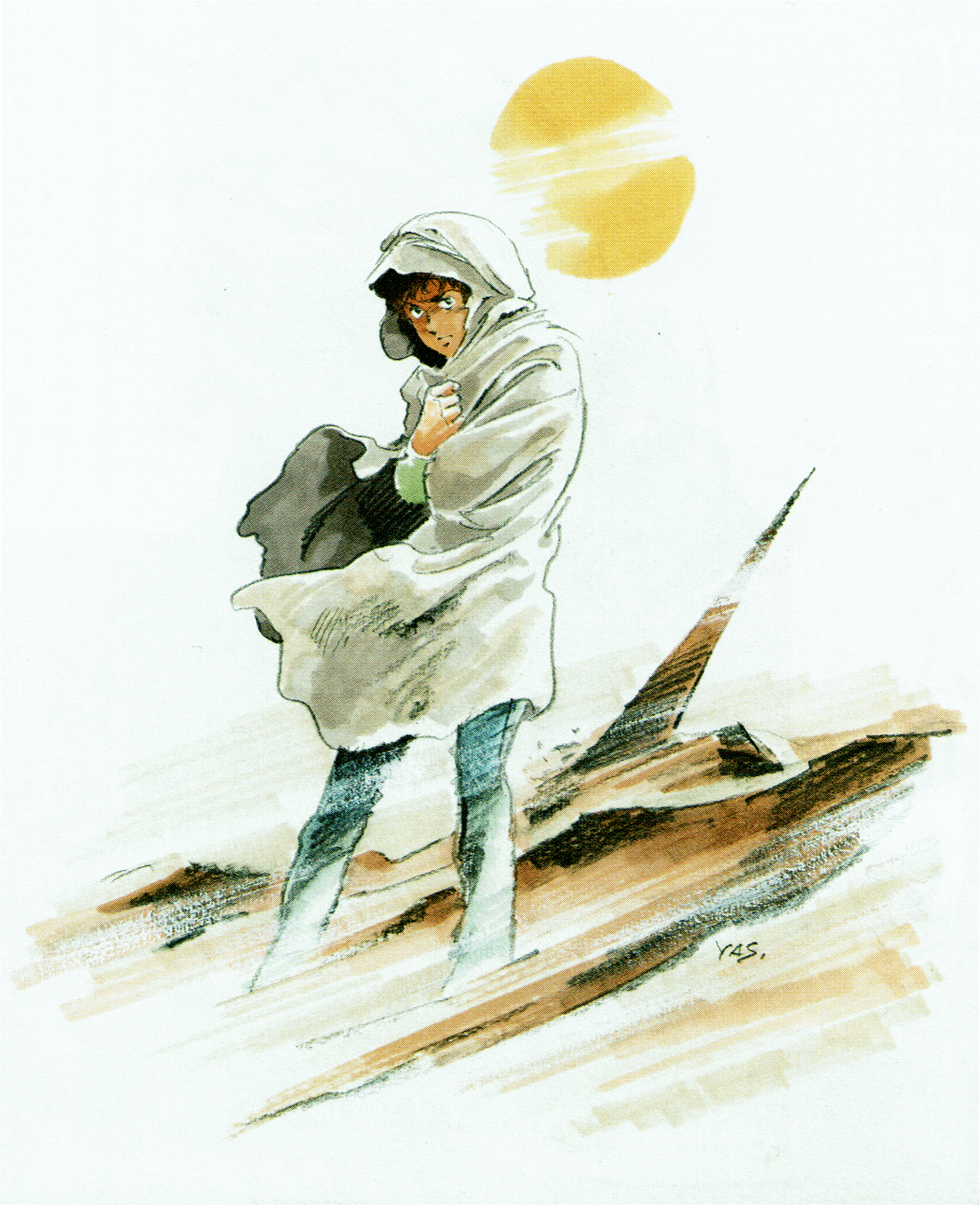absurdres amuro_ray dessert earth_federation_space_forces food gundam highres mecha non-web_source pilot robot signature sun yasuhiko_yoshikazu
