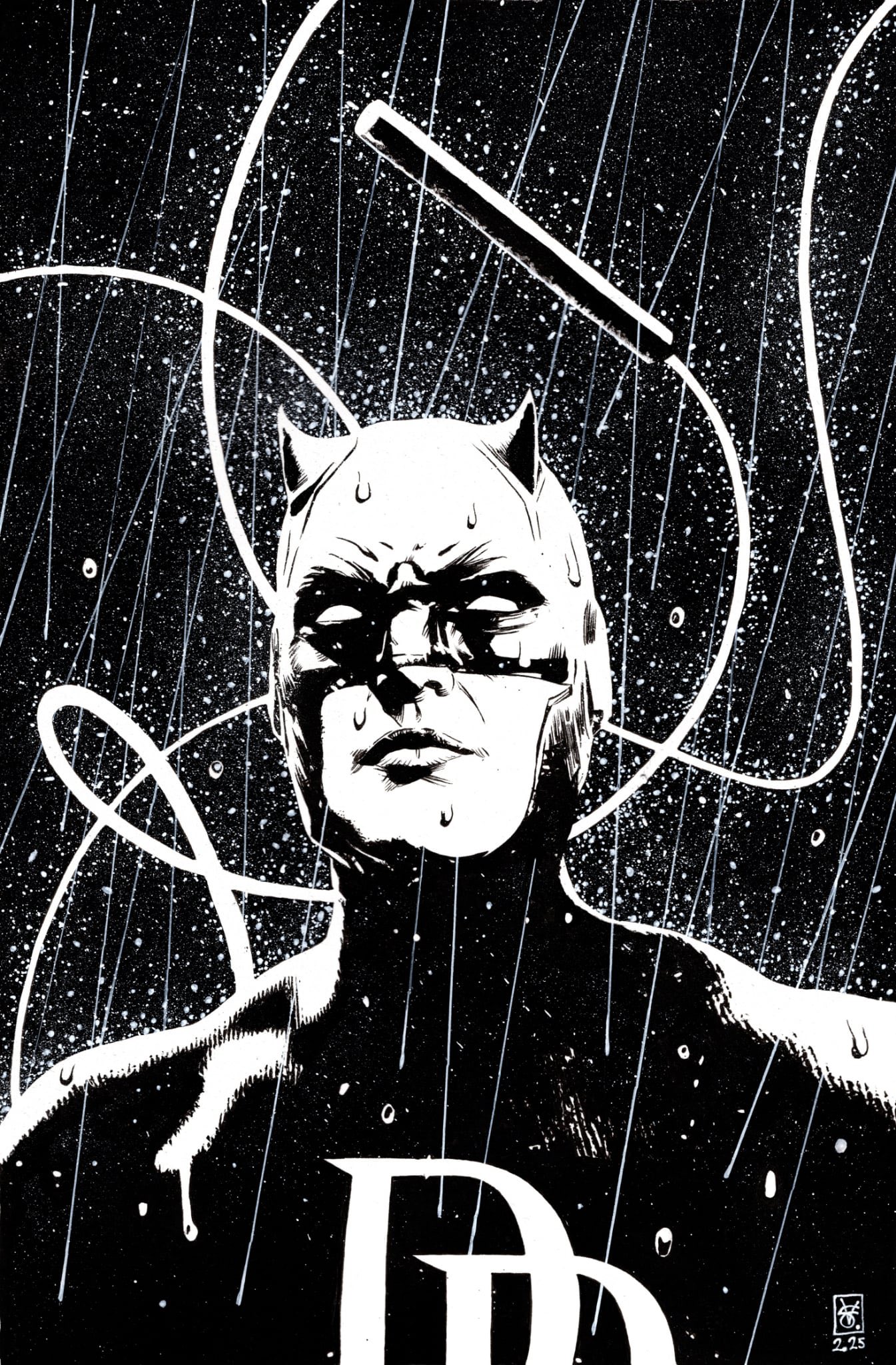 1boy black_background character_logo commentary cowl daredevil dark english_commentary highres horned_mask male_focus marvel mask monochrome muscular muscular_male no_pupils nunchaku rain solo superhero_costume upper_body valerio_giangiordano weapon wet